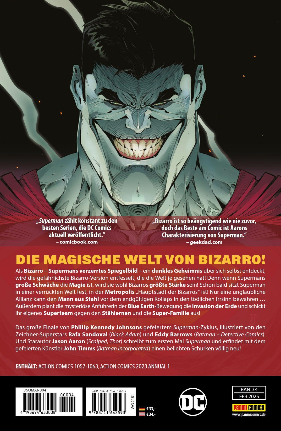DIE MAGISCHE WELT VON BIZARRO! Als Bizarro - Supermans verzerrtes Spiegelbild - ein dunkles Geheimnis über sich selbst entdeckt, wird die gefährlichste Bizarro-Version entfesselt, die die Welt je gesehen hat! Denn wenn Supermans große Schwäche die Magie ist, wird sie wohl Bizarros größte Stärke sein! Schon bald sitzt Superman in einer verrückten Welt fest, in der Metropolis Hauptstadt der Bizarros ist! Nur eine unglaubliche Allianz kann den Mann aus Stahl vor dem endgültigen Kollaps in den tödlichen Irrsinn bewahren ... Außerdem plant die mysteriöse Anführerin der Blue Earth-Bewegung die Invasion der Erde und schickt ihr eigenes Superteam gegen den Stählernen und die Super-Familie aus! Das große Finale von Phillip Kennedy Johnsons gefeiertem Superman-Zyklus, illustriert von den Zeichner-Superstars Rafa Sandoval (Black Adam) und Eddy Barrows (Batman - Detective Comics). Und Starautor Jason Aaron (Scalped, Thor) schreibt zum ersten Mal Superman und erfindet mit dem gefeierten Künstler John Timms (Batman Incorporated) einen beliebten Schurken völlig neu! ENTHÄLT: ACTION COMICS 1057-1063, ACTION COMICS 2023 ANNUAL 1