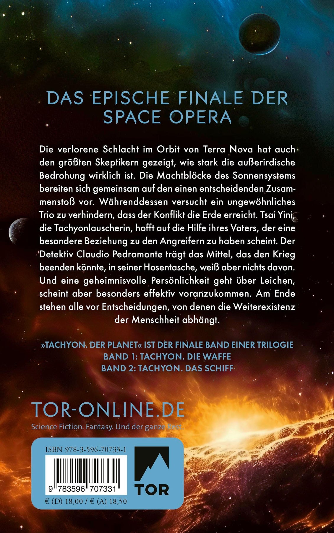 Die verlorene Schlacht im Orbit von Terra Nova hat auch den größten Skeptikern gezeigt, wie stark die außerirdische Bedrohung wirklich ist. Die Machtblöcke des Sonnensystems bereiten sich gemeinsam auf den einen entscheidenden Zusammenstoß vor. Währenddessen versucht ein ungewöhnliches Trio zu verhindern, dass der Konflikt die Erde erreicht. Tsai Yini, die Tachyonlauscherin, hofft auf die Hilfe ihres Vaters, der eine hundertjährige Reise überlebt hat und eine besondere Beziehung zu den Angreifern zu haben scheint. Der Detektiv Claudio Pedramonte trägt das Mittel, das den Krieg beenden könnte, in seiner Hosentasche, weiß aber nichts davon. Und eine geheimnisvolle Persönlichkeit geht über Leichen, scheint aber besonders effektiv voranzukommen. Am Ende stehen alle vor Entscheidungen, von denen die Weiterexistenz der Menschheit abhängt.