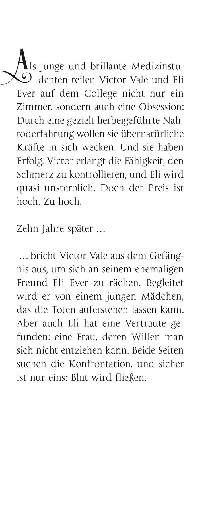 Victor Vale und Eli Ever wollen sterben. Allerdings nicht, um tot zu bleiben, sondern um mit außergewöhnlichen Fähigkeiten wieder aufzuerstehen. Als junge, brillante Medizinstudenten wissen sie genau, was sie tun. Sie planen das Experiment minutiös ­? und haben Erfolg: Beide kommen verwandelt wieder ins Leben zurück. Eli entwickelt eine erstaunliche Regenerationskraft und wird praktisch unsterblich, Victor kann anderen Schmerz zufügen oder nehmen.