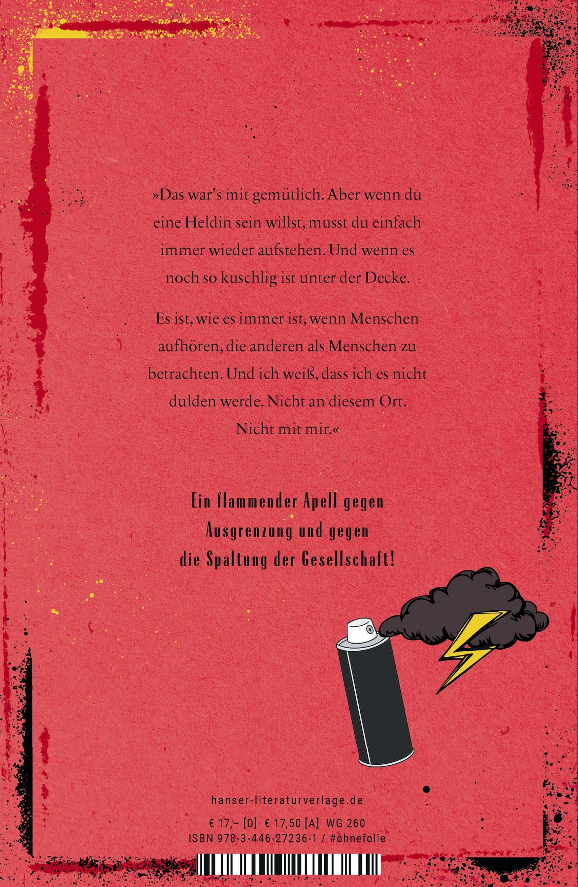 Madina hat den Krieg und seine Schrecken, die gefährliche Flucht hinter sich gelassen. Endlich hat sie das Gefühl, angekommen zu sein, wohnt mit ihrer Familie bei ihrer besten Freundin Laura, trägt keine schlecht sitzenden Kleider aus der Spendenkiste mehr und gehört in der Schule ganz selbstverständlich dazu. Aber dann kippt die Stimmung. Rassistische Schmierereien tauchen auf, und jeden Donnerstag skandiert eine Gruppe auf dem Hauptplatz: "Ausländer raus!", erst wenige, dann immer mehr. Eine Zerreißprobe, nicht nur für Madina, sondern für alle, die in dem Ort leben. Doch Madina beschließt, nicht wegzuschauen - und sie findet Verbündete. Ein flammender Appell gegen Ausgrenzung und die Spaltung der Gesellschaft!