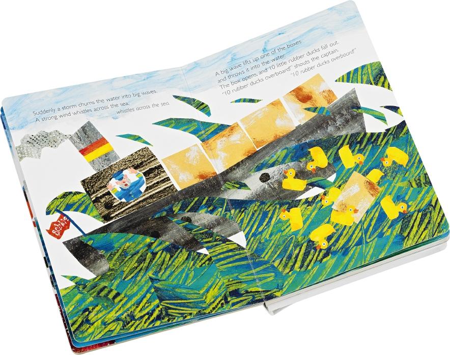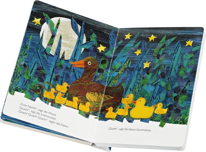 Gummi-Quietsche-Enten machen glücklich! Eric Carle erzählt nach einer wahren Begebenheit die Geschichte von 10 Gummienten, die auf See über Bord gehen und eine abenteuerliche Reise unternehmen. Die zehnte landet am Ende bei einer Entenfamilie, die sie freundlich aufnimmt. Drückt man auf der letzten Seite die kleine Gummiente, quiekt sie, um die echten Enten vergnügt zu begrüßen. Der Bilderbuchklassiker erstmals als handliche Pappausgabe - mit integrierter echter Gummiente zum Quietschen.
