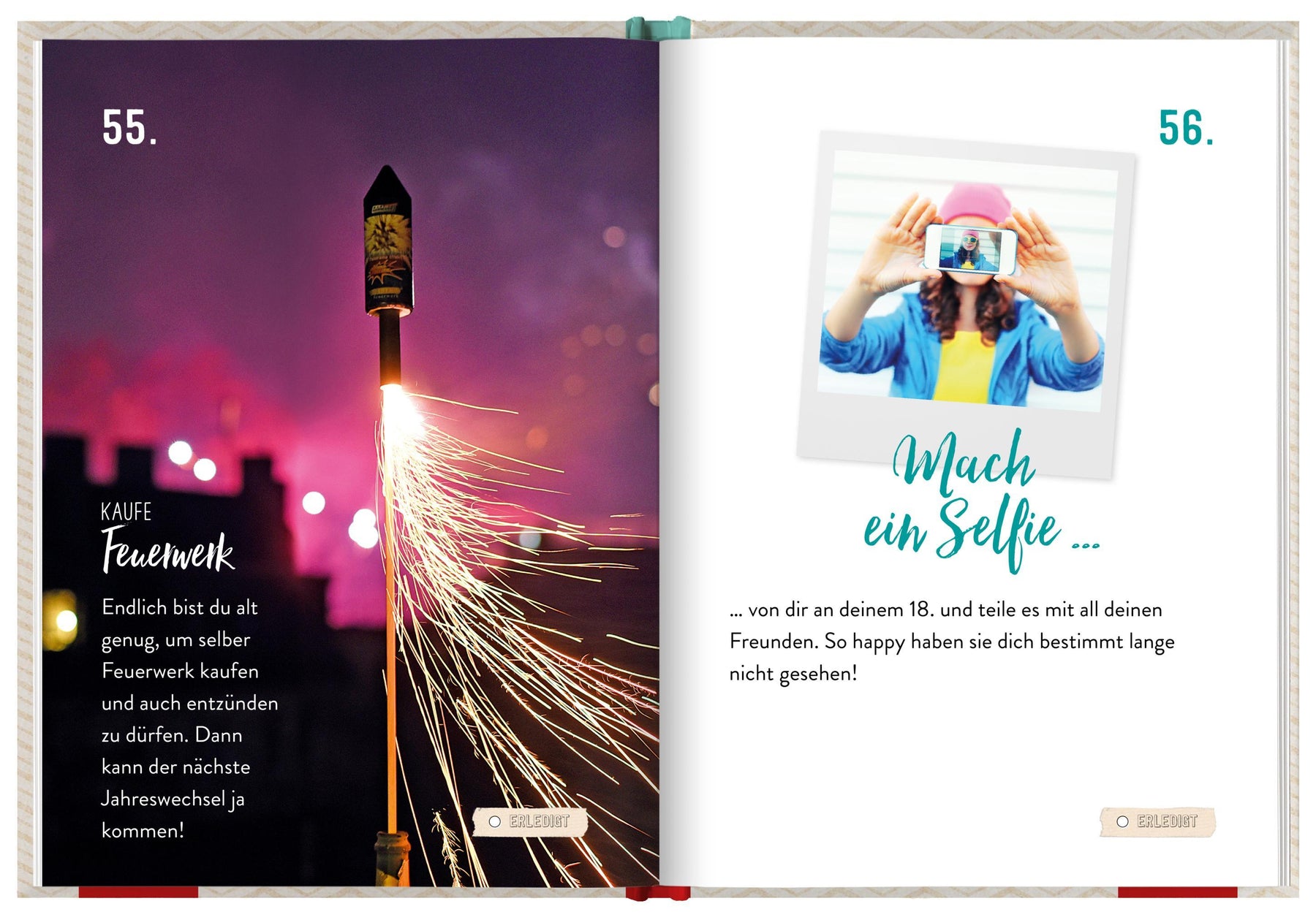 Das 100 Dinge Buch inspiriert mit viel Humor dazu, die Volljährigkeit und das Leben zu genießen. Neue Dinge ausprobieren. Die Welt entdecken. Mit einem Augenzwinkern werden auch Ideen beschrieben, die ab sofort keinem Einverständnis der Eltern mehr bedürfen. Jede erfüllte Aufgabe und jedes Erlebnis kann auf der entsprechenden Seite abgehakt werden.