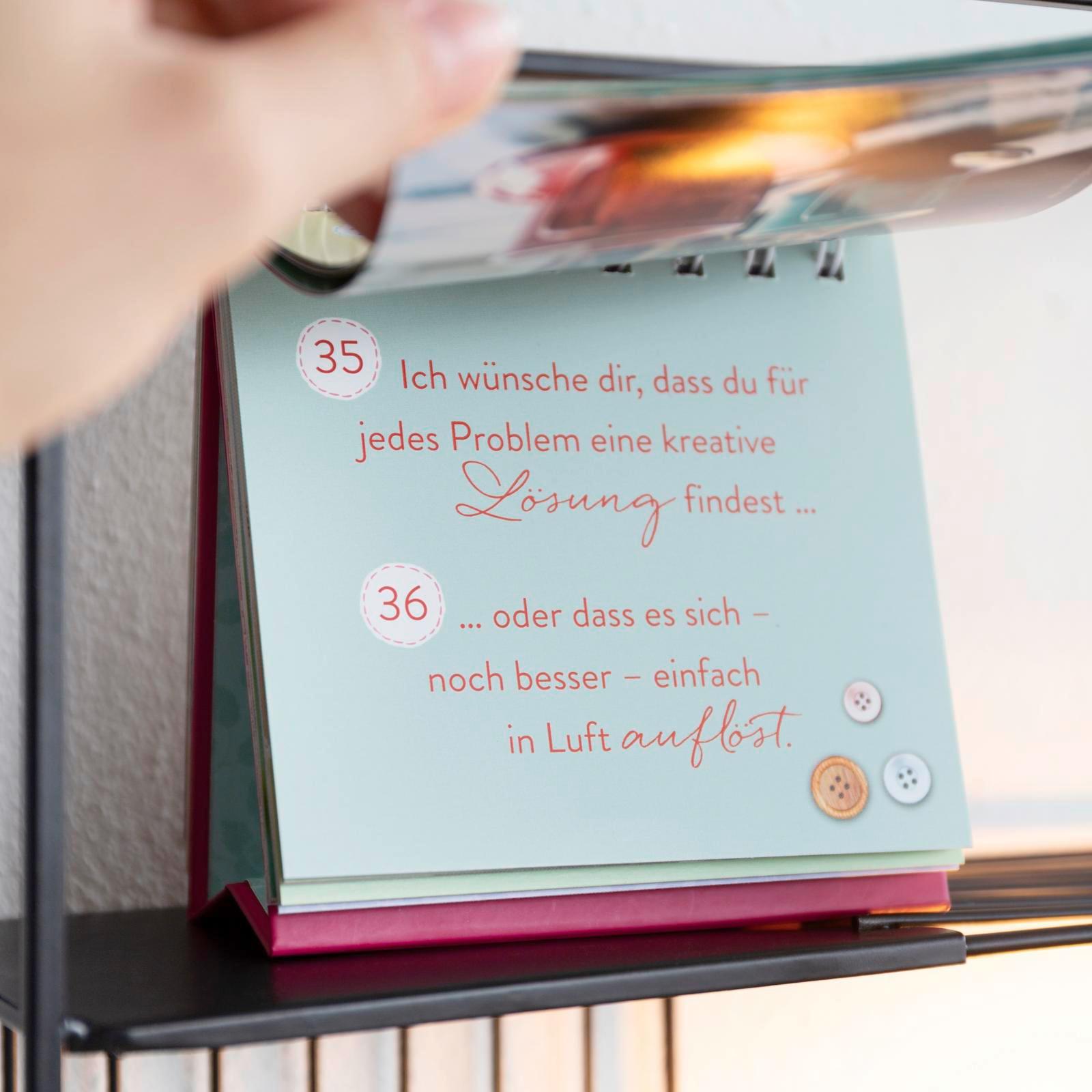 Dieser Spiralaufsteller ist ein dekorativer Hingucker in jeder Wohnung. Wann immer er möchte, kann der Beschenkte einen neuen Wunsch aufschlagen und sich eine Zeit lang von diesem begleiten lassen.