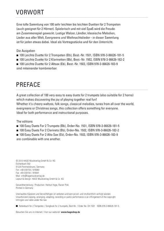 Eine tolle Sammlung von 100 sehr leichten bis leichten Duetten für 2 Trompeten (auch geeignet für 2 Hörner). Spielerisch und mit viel Spaß wird die Freude am Zusammenspiel geweckt. Lustige Walzer, Ländler, klassische Melodien, Lieder aus aller Welt, Evergreens und Weihnachtslieder - in dieser Sammlung ist für jeden etwas dabei. Ideal als Vortragsstücke und für den Unterricht. Die Ausgaben: 100 Leichte Duette für 2 Trompeten (Bb), Best.-Nr. 1501, ISBN 978-3-86626-181-5 100 Leichte Duette für 2 Klarinetten (Bb), Best.-Nr. 1502, ISBN 978-3-86626-182-2 100 Leichte Duette für 2 Altsax (Eb), Best.-Nr. 1503, ISBN 978-3-86626-183-9 sind miteinander kombinierbar.
