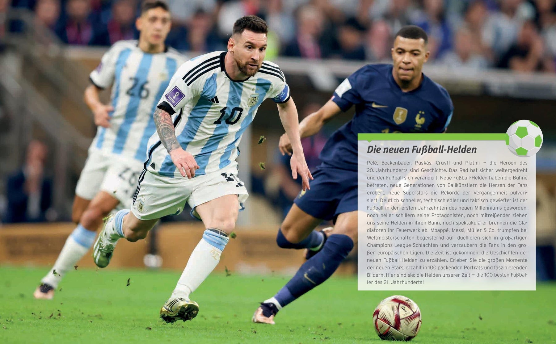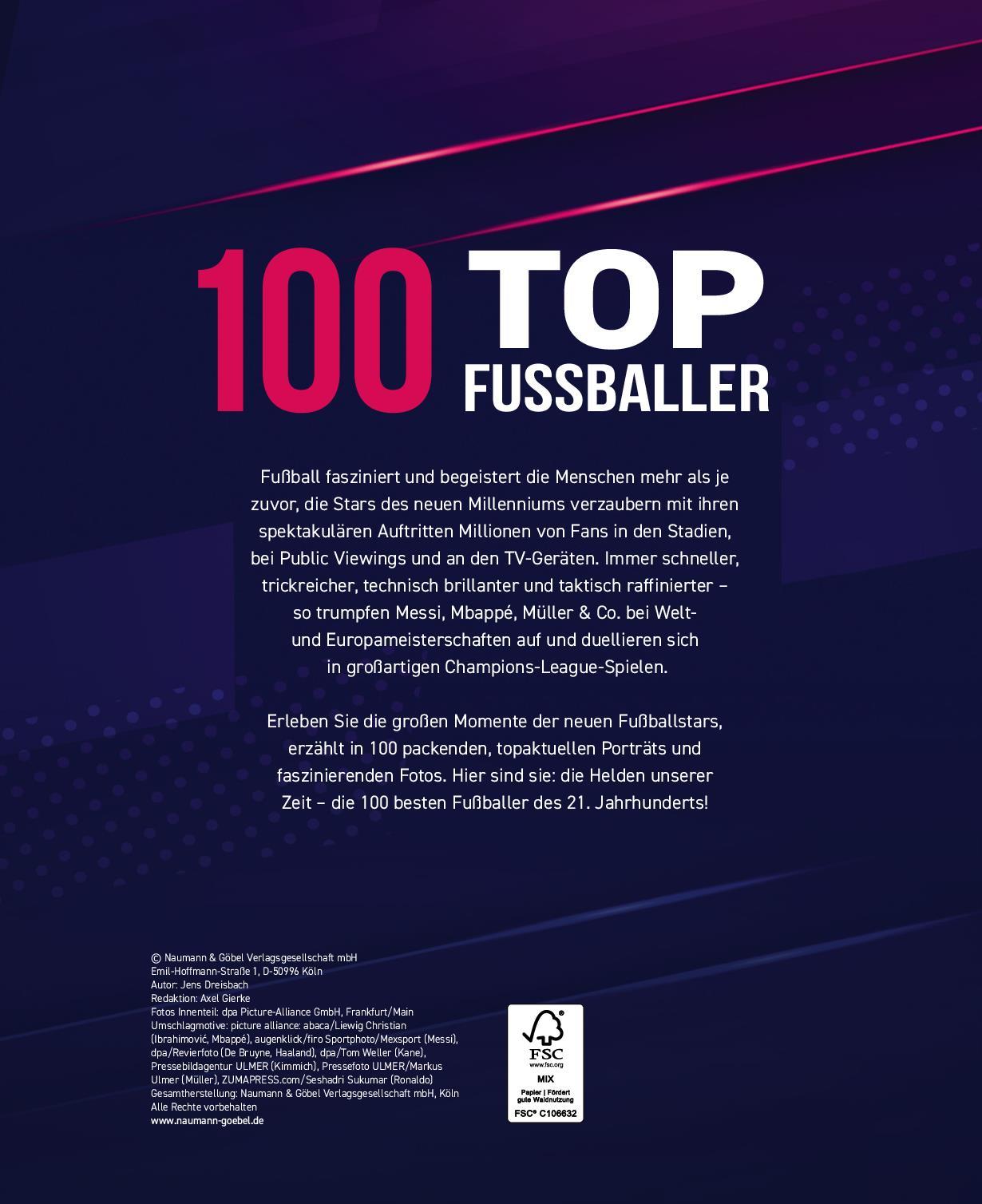 Fußball fasziniert und begeistert die Menschen mehr als je zuvor, die Stars des neuen Millenniums verzaubern mit ihren spektakulären Auftritten Millionen von Fans in den Stadien, bei Public Viewings und an den TV-Geräten. Immer schneller, trickreicher, technisch brillanter und taktisch gewiefter - so trumpfen Messi, Mbappé, Kane, Kimmich & Co. bei Welt- und Europameisterschaften auf und duellieren sich in großartigen Champions-League-Spielen. Erlebe die großen Momente der neuen Fußballstars, erzählt in 100 packenden, topaktuellen Porträts und faszinierenden Bildern. Hier sind sie: die Helden unserer Zeit - die 100 besten Fußballer des 21. Jahrhunderts!