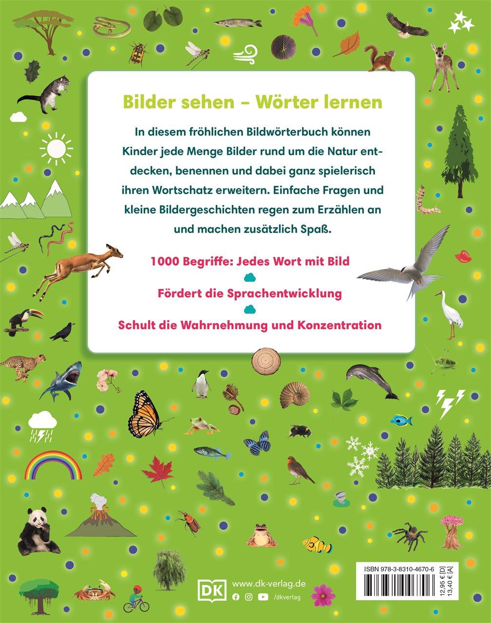 Vom tierischen Treiben im heimischen Garten über die Jahreszeiten bis zum faszinierenden Lebensraum im weiten Ozean - in der Natur gibt es so viel zu entdecken! Dieses prall gefüllte und farbenfroh illustrierte Bildwörterbuch hilft Kleinkindern ab 4 Jahren mit 1.000 Fotos und Begriffen rund um Natur, Tiere, Pflanzen, Wetter, Essen, Ozeane, Regenwälder, Wüsten und Naturschutz beim Sprechen lernen. Einfache Sätze, Verben und Fragen vermitteln einen vielseitigen und altersgerechten Wortschatz.