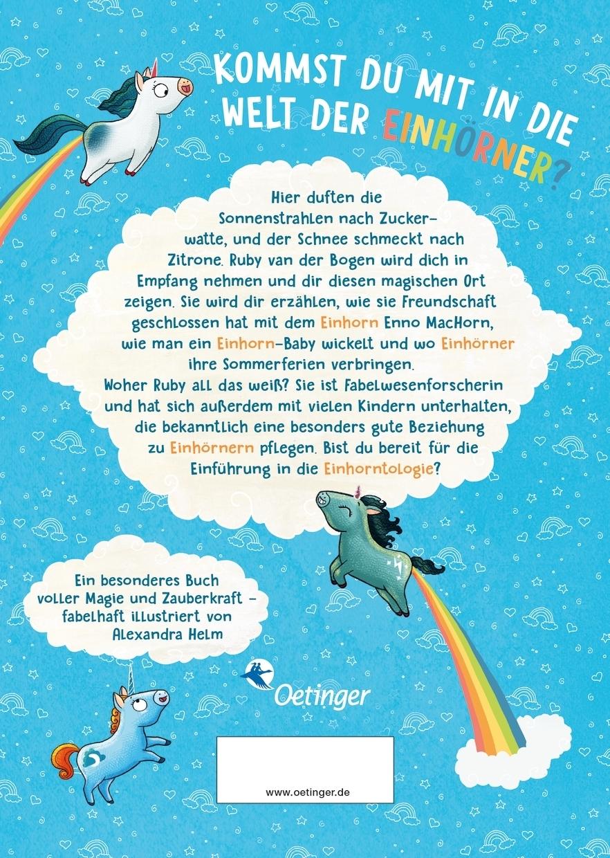 Die Welt der Einhörner ist eine fantastische Welt voller Magie. Wie sieht es dort eigentlich aus? Wie freundet man sich mit einem Einhorn an? Und wo machen Einhörner eigentlich Urlaub? All das erzählt die Bestsellerautorin Ruby van der Bogen in ihren zauberhaften Vorlesegeschichten für Kinder ab 4 Jahren. Ob von ihrem besten Freund, dem Einhorn Enno MacHorn, oder von ihrem magischen Häuschen in der Einhornwelt - das Buch steckt voller märchenhafter Geschichten und Bilder, die einen einzigartigen Einblick in das zauberhafte Universum der Einhörner geben. Zusätzlich erfahren Kinder, wie sie selbst zu kleinen Einhorntolog*innen werden und die Einhornwelt ganz einfach selbst erforschen können. Ein wunderbarer Vorlesespaß für große und kleine Einhorn-Fans und eine fantastische Reise in eine Welt voller Wunder!