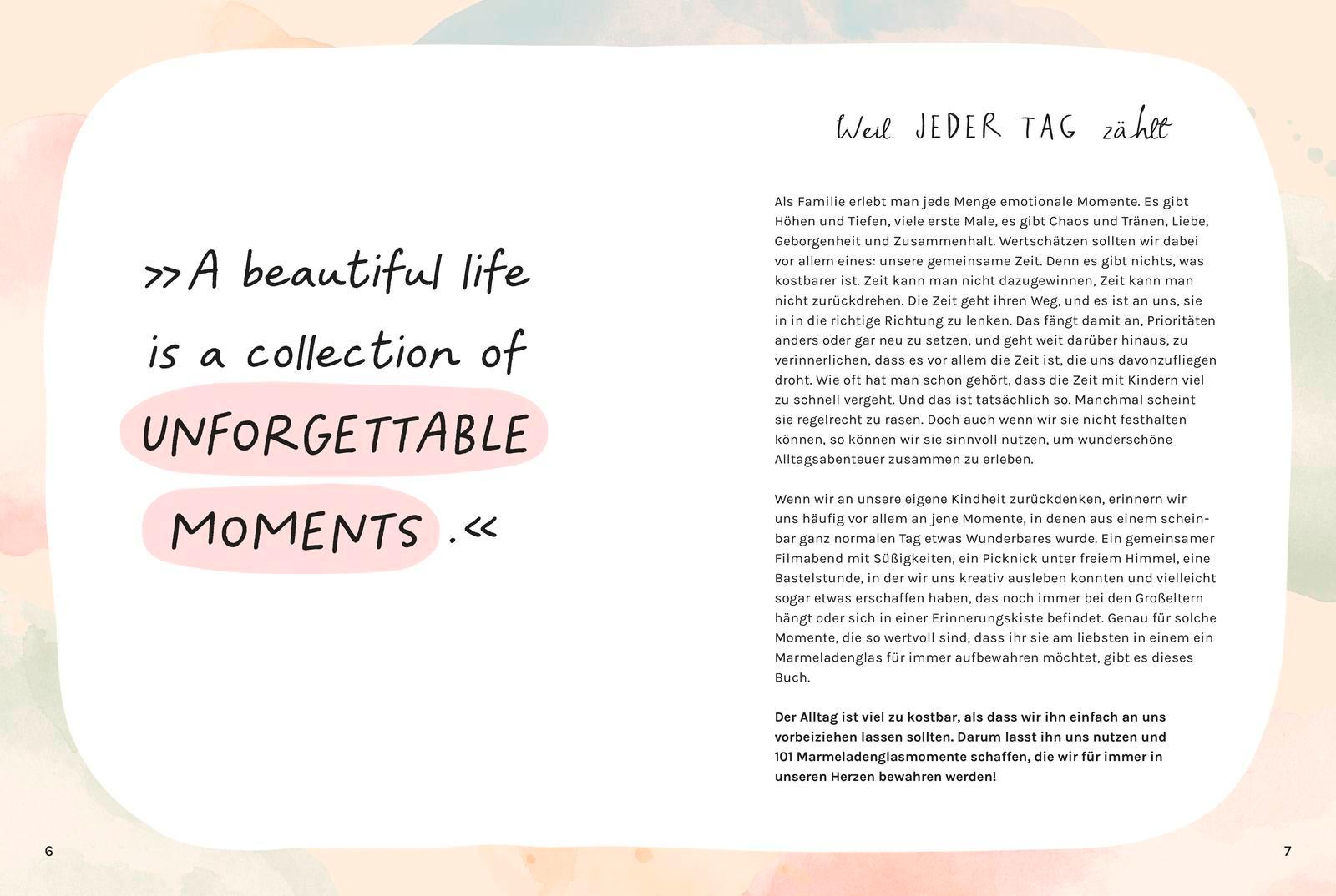 Familienzeit ist kostbar und zugleich unbezahlbar. Sie wertzuschätzen und gemeinsam unvergessliche Momente zu schaffen, an die wir uns auch nach vielen Jahren gern zurückerinnern, ist ein großes Glück. In diesem ganz besonderen Bucket-List-Buch inspirieren 101 Marmeladenglas-Momente der beliebten Familieninfluencerin Marisa Hart zum Nachmachen, Festhalten und Erinnern. Ein Inhaltsverzeichnis macht das Wiederfinden der Aufgaben leichter, die außerdem thematisch geclustert sind. Durch das wunderbare Design der Grafikerin Marietheres Viehler geht Marmeladenglas-Momente weit über ein Listenbuch hinaus und wird zum perfekten Familienalbum.