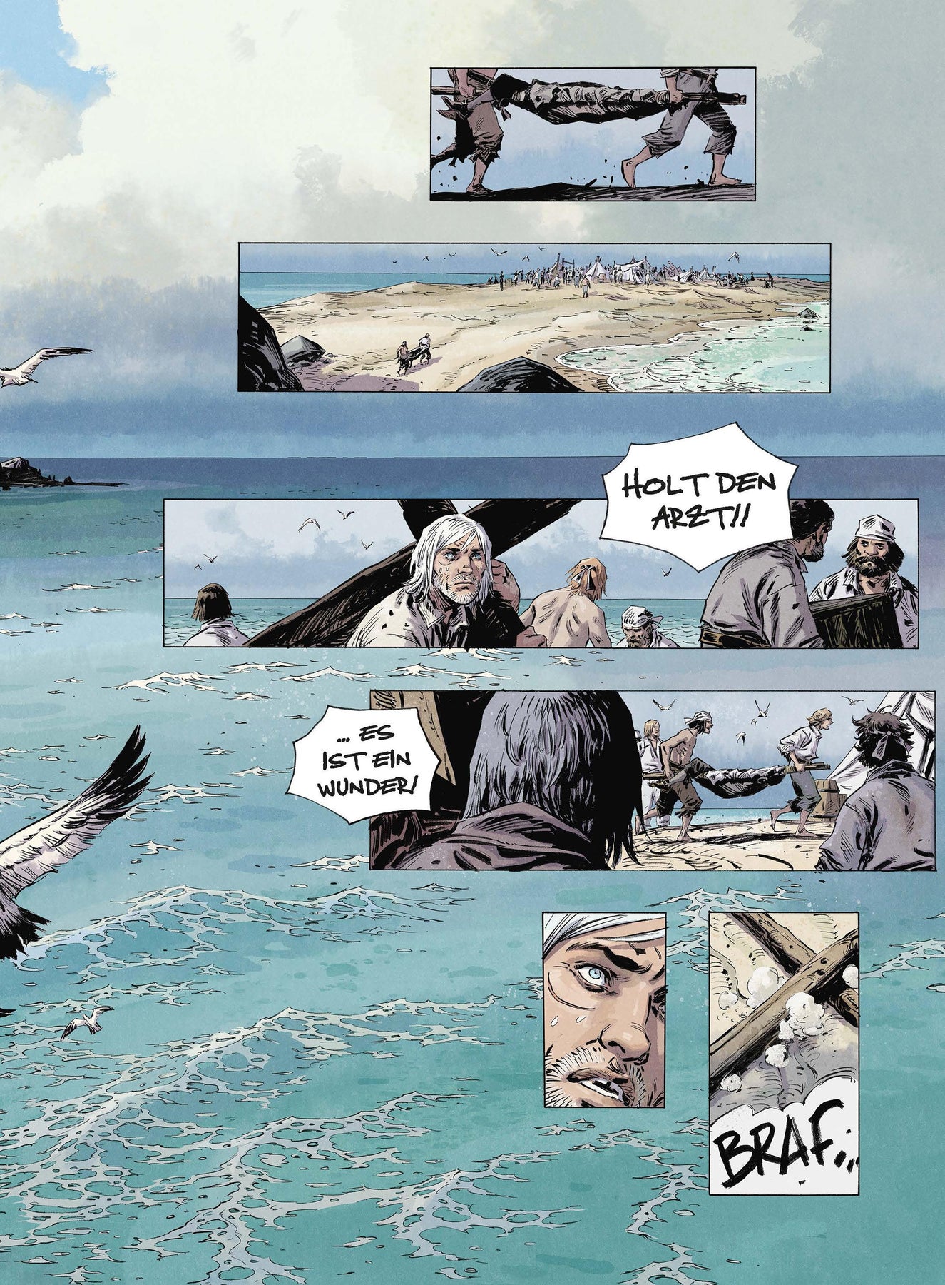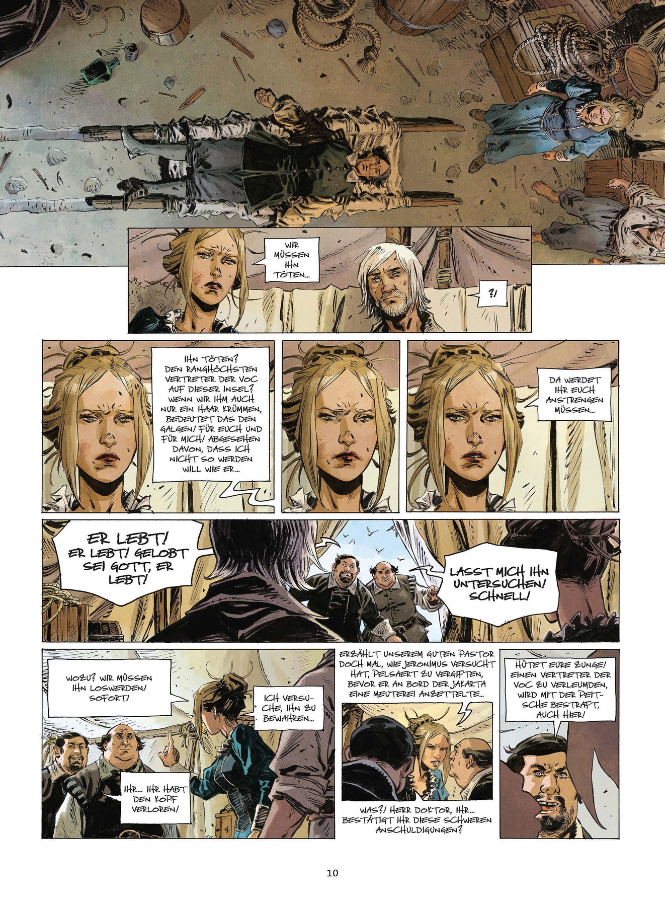 Wir schreiben das Jahr 1629. Die Niederländische Ostindien-Kompanie ist das reichste Unternehmen der Menschheitsgeschichte und stets daran interessiert, ihren unvorstellbaren Wohlstand zu vergrößern. In ihrem Namen wird die 'Jakarta' nach Indonesien aufbrechen. An Bord: genug Gold und Diamanten, um den Herrscher von Sumatra zu bestechen und für die Anliegen der Kompanie hörig zu machen. Die Mannschaft jedoch steht in großem Kontrast zur edlen Ladung: 300 Menschen aus den schmutzigsten Slums von Amsterdam, von der blanken Verzweiflung an Bord des Seelenfängers getrieben. Die Grausamkeit ihrer Offiziere und der ewige Lockruf des Goldes machen die 'Jakarta' zu einem Pulverfass. Ein Funke genügt, um diese schwimmende Hölle auf Erden zur Meuterei zu treiben. Und ein charismatischer Mann namens Jeronimus Cornelius, ruinierter Apotheker und von der Inquisition verfolgt, ist willens, das Streichholz anzuschlagen. Nur eine wohlgeborene Dame, die durch unwahrscheinliche Zufälle ebenfalls an Bord ist, könnte dem skrupellosen Ketzer Einhalt gebieten... Dieser maritime Psychothriller in zwei Bänden greift eine der schrecklichsten Begebenheiten der Seefahrtsgeschichte auf, den Schiffbruch und die Meuterei auf der 'Batavia'. Gier und Grausamkeit, Wahnsinn, Massaker und Überlebenskampf werden von Xavier Dorison meisterhaft zu einem intensiven Stoff verwoben, der von Thimothée Montaigne auf der Höhe seines Schaffens kongenial illustriert wird. Abschlussband der Serie