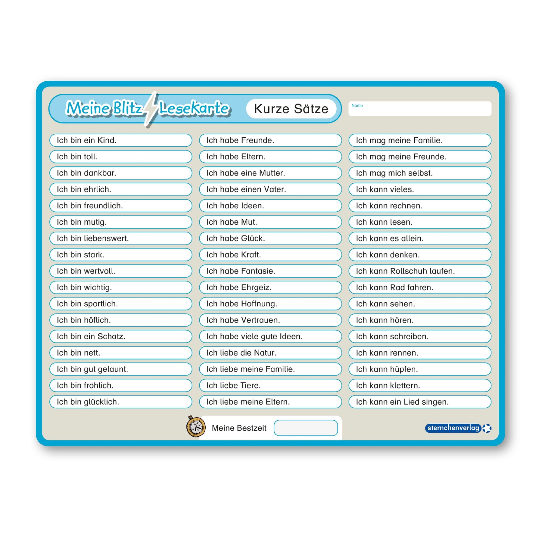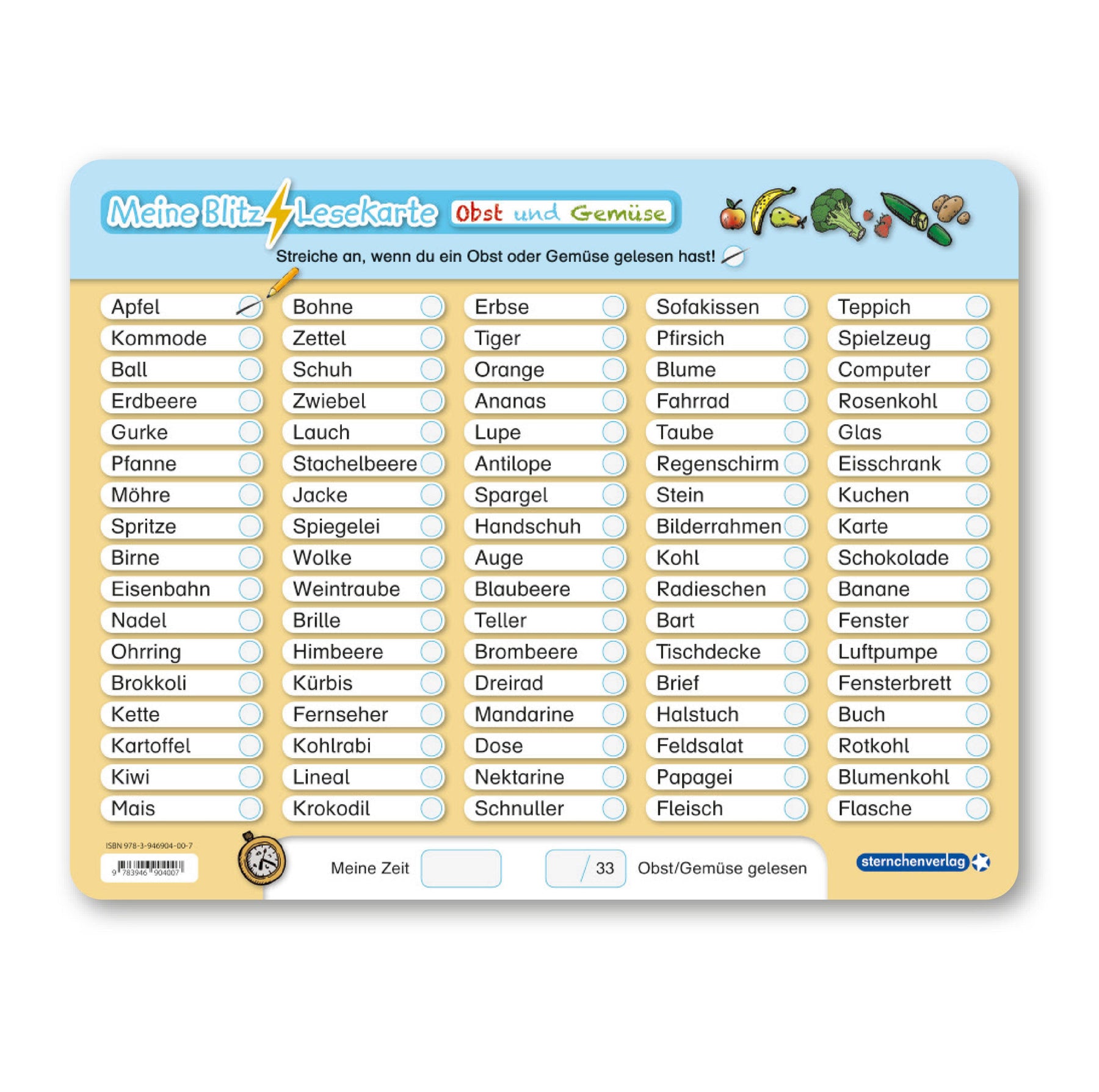 Praktisch und stabil, prima geeignet für den täglichen Gebrauch im Unterricht und zu Hause. Meine Blitzlesekarte - Die 200 häufigsten Wörter - ISBN 978-3-946904-01-4 Die 100/200 häufigsten Wörter, die Kinder in der Grundschule verwenden, machen etwa 50% der Wörter eines Textes aus. Es ist daher sinnvoll, diese zügig lesen und richtig schreiben zu können. Zum Üben dieser Wörter dient das Blitzlesen. Die Schüler sollen die Wörter auf einen Blick erkennen und lesen. Durch das Üben werden die Kinder sicherer und verinnerlichen diesen wichtigen Wortschatz. Die Bestzeiten können in einem Feld mit einem Folienstift immer wieder neu eingetragen werden. Meine Blitzlesekarte - Kurze Sätze - ISBN 978-3-910429-29-1 Mit dieser Blitzlesekarte üben die Kinder erste kleine Sätze im eigenen Tempo zu lesen. Durch das Wiederholen der gleichen Häufigkeitswörter in den Sätzen, erlernt das Kind flüssig und selbstsicher zu lesen. Alleine oder auch in Partnerarbeit kann die Zeit gestoppt werden und in einem Feld immer wieder neu eingetragen werden. Die Blitzlesekarte ist ideal für die Erstklässler geeignet und wird besonders zur Leseförderung und im DaZ-Bereich eingesetzt. Meine Blitzlesekarte - Tiere, Obst und Gemüse ISBN 978-3-946904-00-7 Die Lernvorlage beinhaltet jeweils 85 Wörter auf 2 Seiten. Der Schüler soll nun durch konzentriertes Lesen auf der ersten Seite alle gefundenen Tierwörter und auf der zweiten Seite alle Obst- und Gemüsewörter in den Kästchen anstreichen. Am Ende kann das Kind immer wieder seine Bestzeit und die Anzahl der gefundenen Suchwörter in die vorgesehenen Felder eintragen. Die Blitzlesekarte schult somit das Leseverstehen sowie das flüssige und aufmerksame Lesen. Stabile Tafeln im großen Format 32,5 x 25 cm (Vorder- und Rückseite)