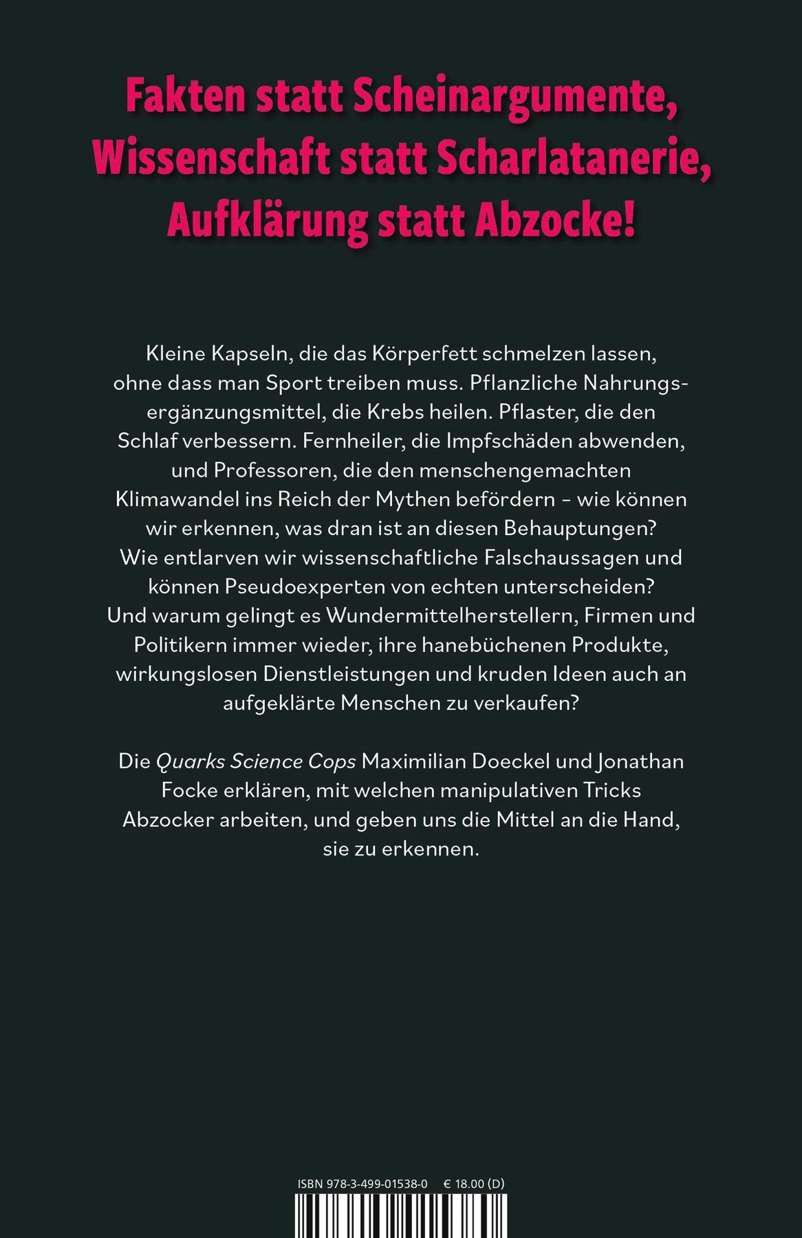 Die Wissenschaftsjournalisten und Quarks Science Cops Maximilian Doeckel und Jonathan Focke entlarven in ihrem Buch die schmutzigen Tricks und manipulativen Techniken, mit denen Wundermittelhersteller, selbst erklärte 'Heiler' und andere Geschäftemacher versuchen, Profit aus der Gutgläubigkeit der Menschen zu schlagen. Deren Methoden sind nämlich ziemlich perfide und z. B. darauf ausgelegt, emotionale (Not-)Situationen auszunutzen. Die Autoren helfen uns dabei, wissenschaftliche Falschaussagen zu erkennen, zeigen, wie wir Pseudoexpertenvon echten unterscheiden können und aufgeklärter durchs Leben gehen. Nach der Lektüre des Buches wissen wir, wo und wie in Deutschland unwissenschaftlicher Unfug erzählt wird. Ob Medizin, Politik, Ernährung, Parawissenschaften - die Quarks Science Cops ermitteln in jedem Lebensbereich und vermitteln Sachinformationen und konkrete Argumentationshilfen für den nächsten WhatsApp-Familenchat mit einer guten Prise Humor.