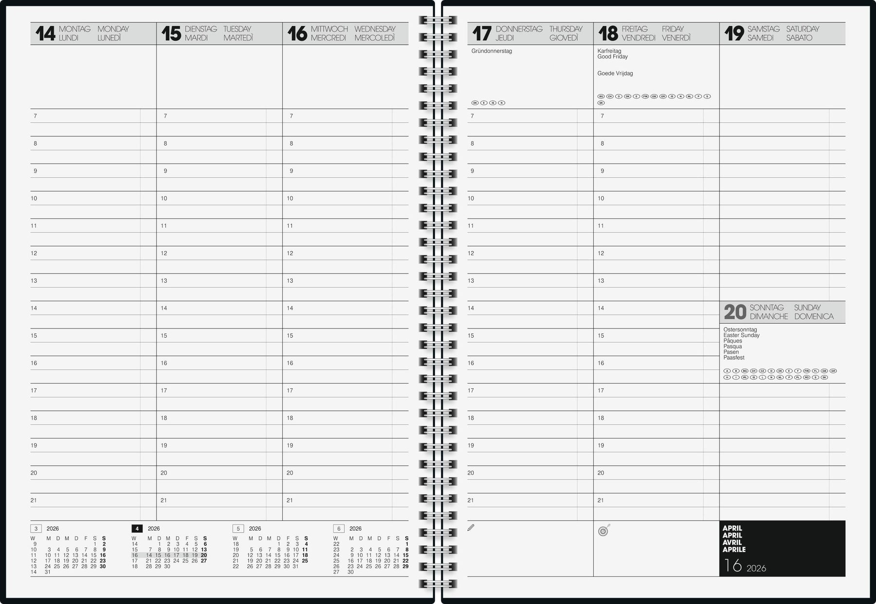 Blattgröße: 210 × 297 mm ? 2 Seiten = 1 Woche ? 144 Seiten, Druckfarbe Kalendarium: schwarz ? 90 g/m², Wire-O-Bindung ? viersprachig: deutsch, englisch, französisch, italienisch ? Kunststoff-Einband, Farbe: schwarz ? Jahresübersicht Vorjahr, aktuelles Jahr und Folgejahr, 4 Seiten Monatsplan aktuelles Jahr, 4 Seiten Folgejahr, Ferientermine Deutschland, Österreich, Südtirol, Frankreich, Schweiz und Luxemburg, 16 Seiten Adressen ? halbstündliche Einteilung von 7-21 Uhr, nicht Sa. und So. ? Eckperforation ? für Kalenderjahr 2026