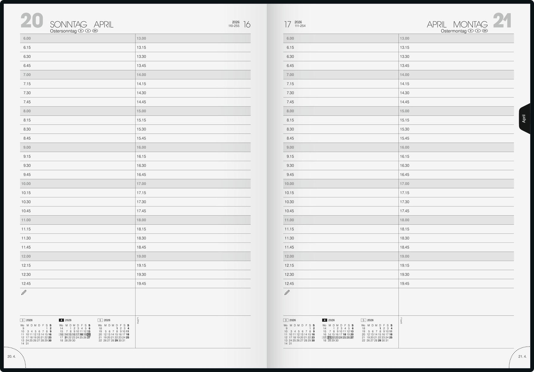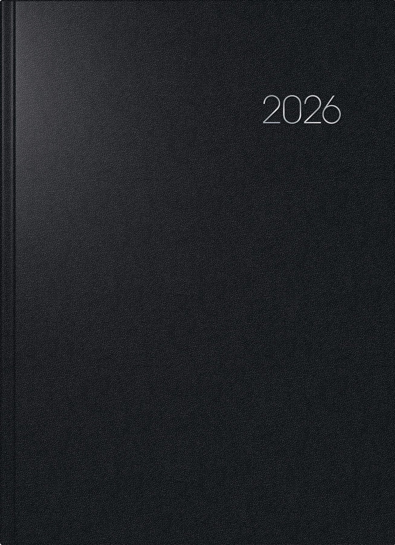 Blattgröße: 210 × 297 mm ? 1 Seite = 1 Tag, 1 Seite Monatsübersicht vor jedem Monat ? 416 Seiten, Druckfarbe Kalendarium: schwarz ? 70 g/m², Fadenheftung ? Kunststoff-Einband Balacron, Farbe: schwarz ? Jahresübersicht Vorjahr, aktuelles Jahr und Folgejahr, 12 Seiten Monatsplan aktuelles Jahr, 6 Seiten Folgejahr, Ferientermine Deutschland, 4 Seiten Wissenswertes, 12 Seiten Adressen ? viertelstündliche Einteilung von 6-19.45 Uhr ? Eckperforation, Zeichenband ? für Kalenderjahr 2026