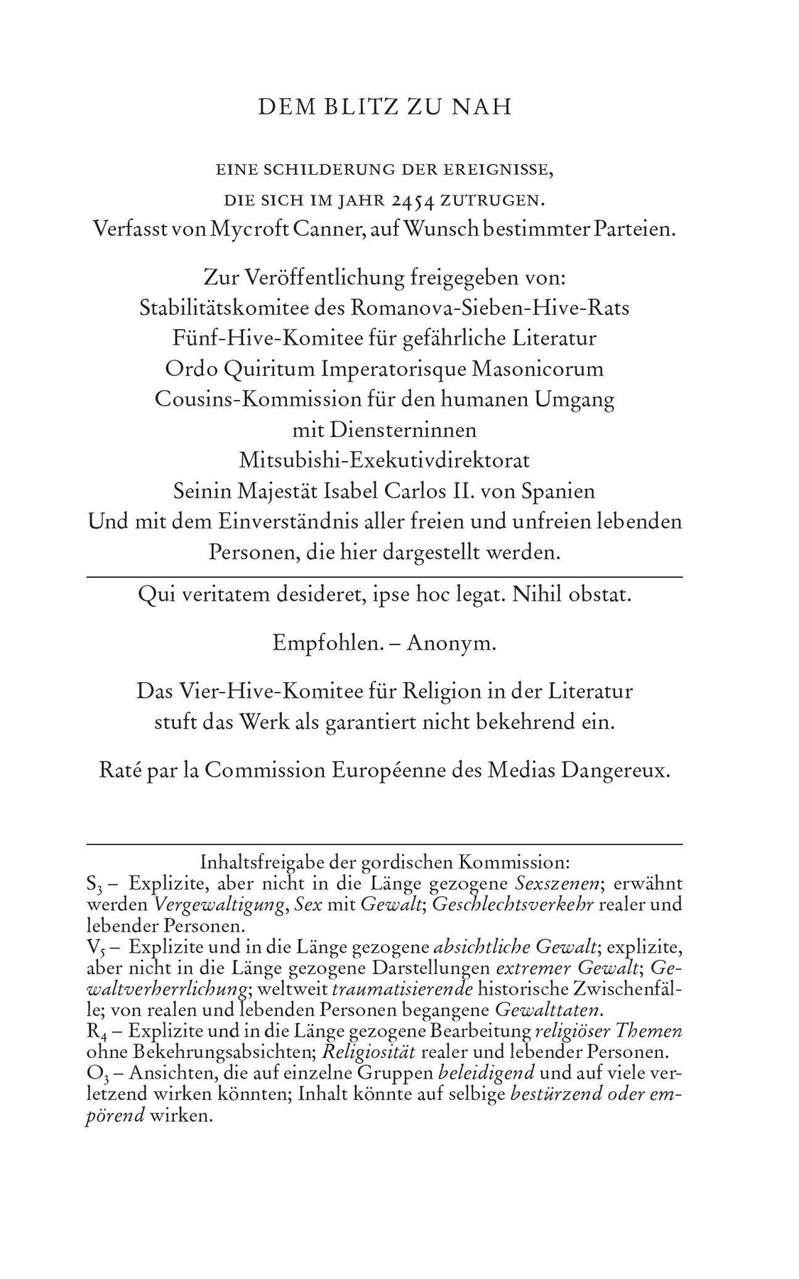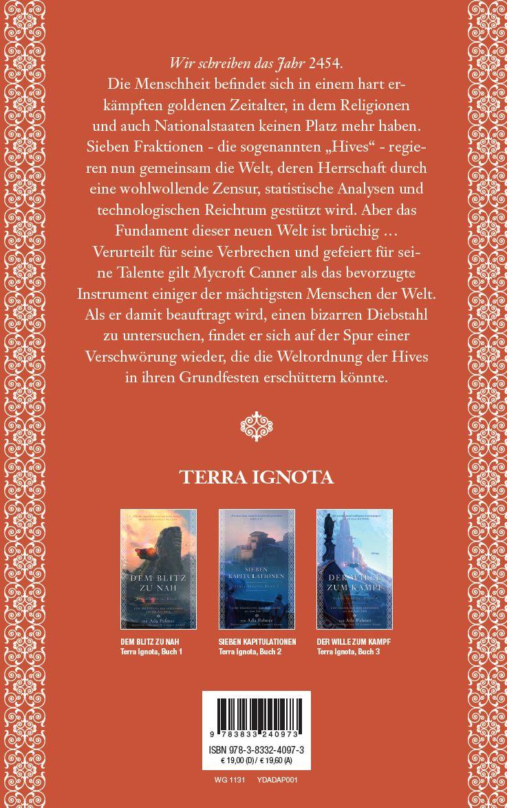 Wir schreiben das Jahr 2454. Die Menschheit befindet sich in einem hart erkämpften goldenen Zeitalter, in dem Religionen und auch Nationalstaaten keinen Platz mehr haben. Sieben Fraktionen - die sogenannten "Hives" - regieren nun gemeinsam die Welt, deren Herrschaft durch eine wohlwollende Zensur, statistische Analysen und technologischen Reichtum gestützt wird. Aber das Fundament dieser neuen Welt ist brüchig ... Verurteilt für seine Verbrechen und gefeiert für seine Talente gilt Mycroft Canner als das bevorzugte Instrument einiger der mächtigsten Menschen der Welt. Als er damit beauftragt wird, einen bizarren Diebstahl zu untersuchen, findet er sich auf der Spur einer Verschwörung wieder, die die Weltordnung der Hives in ihren Grundfesten erschüttern könnte. Band 1 der Reihe Terra Ignota Überblick über die Reihe Terra Ignota Band 1: Dem Blitz zu nah Band 2: Sieben Kapitulationen Band 3: Der Wille zum Kampf