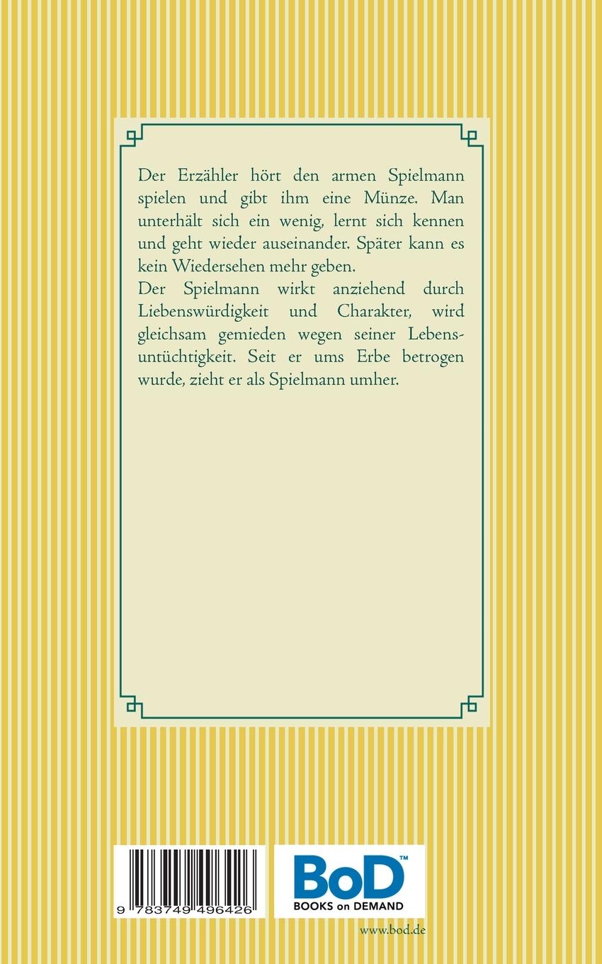 Der Erzähler hört den armen Spielmann spielen und gibt ihm eine Münze. Man unterhält sich ein wenig, lernt sich kennen und geht wieder auseinander. Später kann es kein Wiedersehen mehr geben. Der Spielmann wirkt anziehend durch Liebenswürdigkeit und Charakter, wird gleichsam gemieden wegen seiner Lebensuntüchtigkeit. Seit er ums Erbe betrogen wurde, zieht er als Spielmann umher.