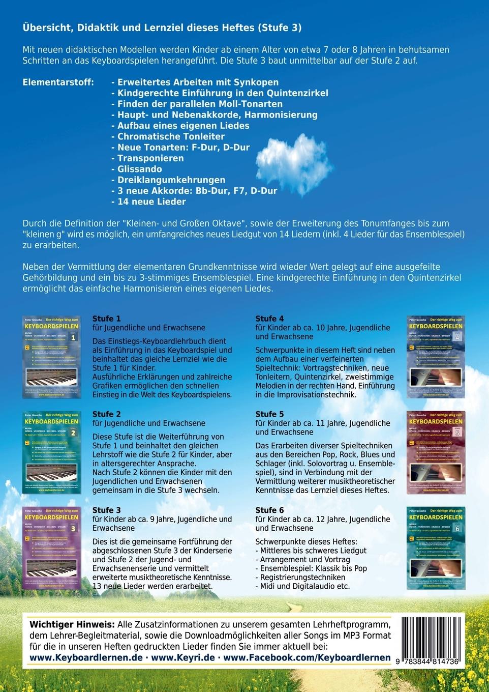Übersicht, Didaktik und Lernziel dieses Heftes (Stufe 3) Mit neuen didaktischen Modellen werden Kinder ab einem Alter von etwa 8 oder 9 Jahren in behutsamen Schritten an das Keyboardspielen herangeführt. Die Stufe 3 baut unmittelbar auf der Stufe 2 auf. Elementarstoff: - Erweitertes Arbeiten mit Synkopen - Kindgerechte Einführung in den Quintenzirkel - Finden der parallelen Moll-Tonarten - Haupt- und Nebenakkorde - Harmonisierung - Aufbau eines eigenen Liedes - Chromatische Tonleiter - Neue Tonarten: F-Dur, D-Dur - Transponieren - Glissando - Dreiklangumkehrungen - 3 neue Akkorde: Bb-Dur, F7, D-Dur - 14 neue Lieder Durch die Definition der "Kleinen- und Großen Oktave", sowie der Erweiterung des Tonumfanges bis zum "kleinen g" wird es möglich, ein umfangreiches neues Liedgut von 14 Liedern (inkl. 4 Lieder für das Ensemblespiel) zu erarbeiten. Neben der Vermittlung der elementaren Grundkenntnisse wird wieder Wert gelegt auf eine ausgefeilte Gehörbildung und ein bis zu 3-stimmiges Ensemblespiel. Eine kindgerechte Einführung in den Quintenzirkel ermöglicht das einfache Harmonisieren eines eigenen Liedes. Als Übungshilfe stehen alle Lieder aus diesem Heft als kostenloses MP3-Download-Paket zur Verfügung. Enthalten ist jedes Lied in 2 Versionen: 1. Das komplette Lied (Melodie und Begleitung) 2. Das Playback (Für das Üben der Melodiestimme) Alle weiteren Informationen finden Sie unter: www.Keyboardlernen.de + www.Keyri.de