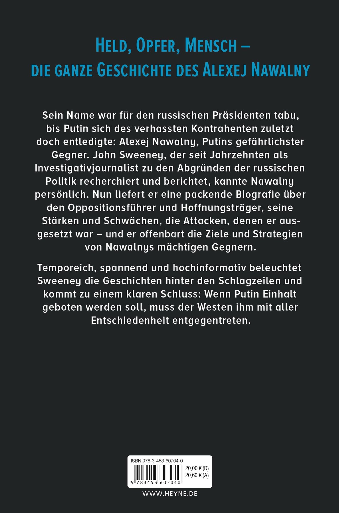 Sein Name war für den russischen Präsidenten tabu, bis Putin sich des verhassten Kontrahenten zuletzt doch entledigte: Alexej Nawalny, Putins gefährlichster Gegner. John Sweeney, der seit Jahrzehnten als Investigativjournalist zu den Abgründen der russischen Politik recherchiert und berichtet, kannte Nawalny persönlich. Nun liefert er eine packende Biografie über den Oppositionsführer und Hoffnungsträger, seine Stärken und Schwächen, die Attacken, denen er ausgesetzt war - und offenbart die Ziele und Strategien von Nawalnys mächtigen Gegnern. Temporeich, spannend und hochinformativ beleuchtet Sweeney die Geschichten hinter den Schlagzeilen und kommt zu einem klaren Schluss: Wenn Putin Einhalt geboten werden soll, muss der Westen ihm mit aller Entschiedenheit entgegentreten.