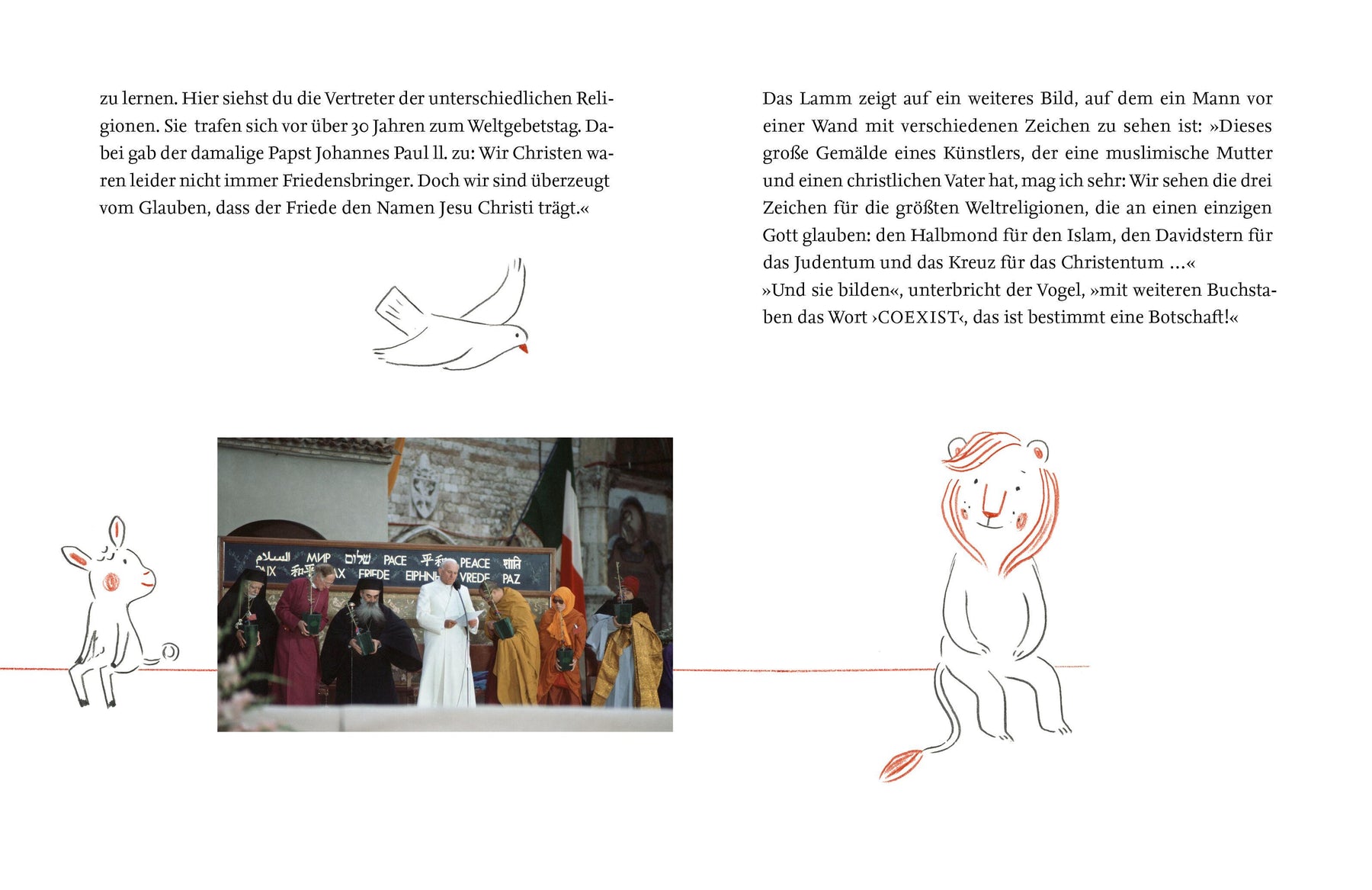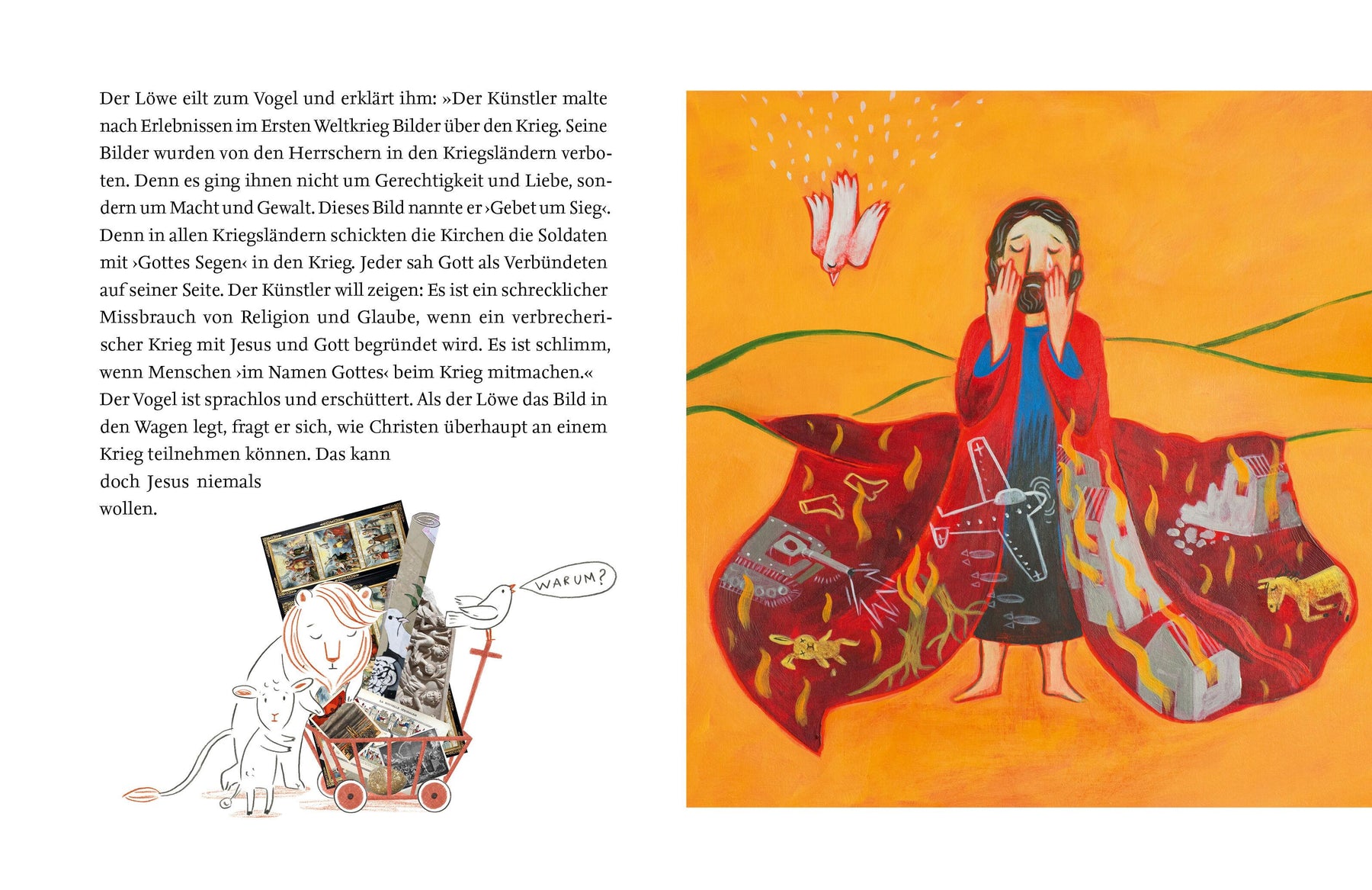Auch der kleine Vogel in diesem Buch fliegt auf seiner Suche nach Frieden schon ziemlich lange und erschöpft umher. Mit letzter Kraft fliegt er in ein Museum und holt Lamm und Löwe aus ihrem Bild vom Jesaja-Tierfrieden heraus. Die beiden zeigen dem Vogel auf ihrem Streifzug durch das menschenleere Museum Bilder von erhofftem und missglücktem Frieden. Dabei lernt der kleine Vogel nach und nach die christliche Friedensbotschaft verstehen, er gewinnt immer mehr an Stärke und Selbstvertrauen und kommt am Ende zu einer entscheidenden Einsicht ...