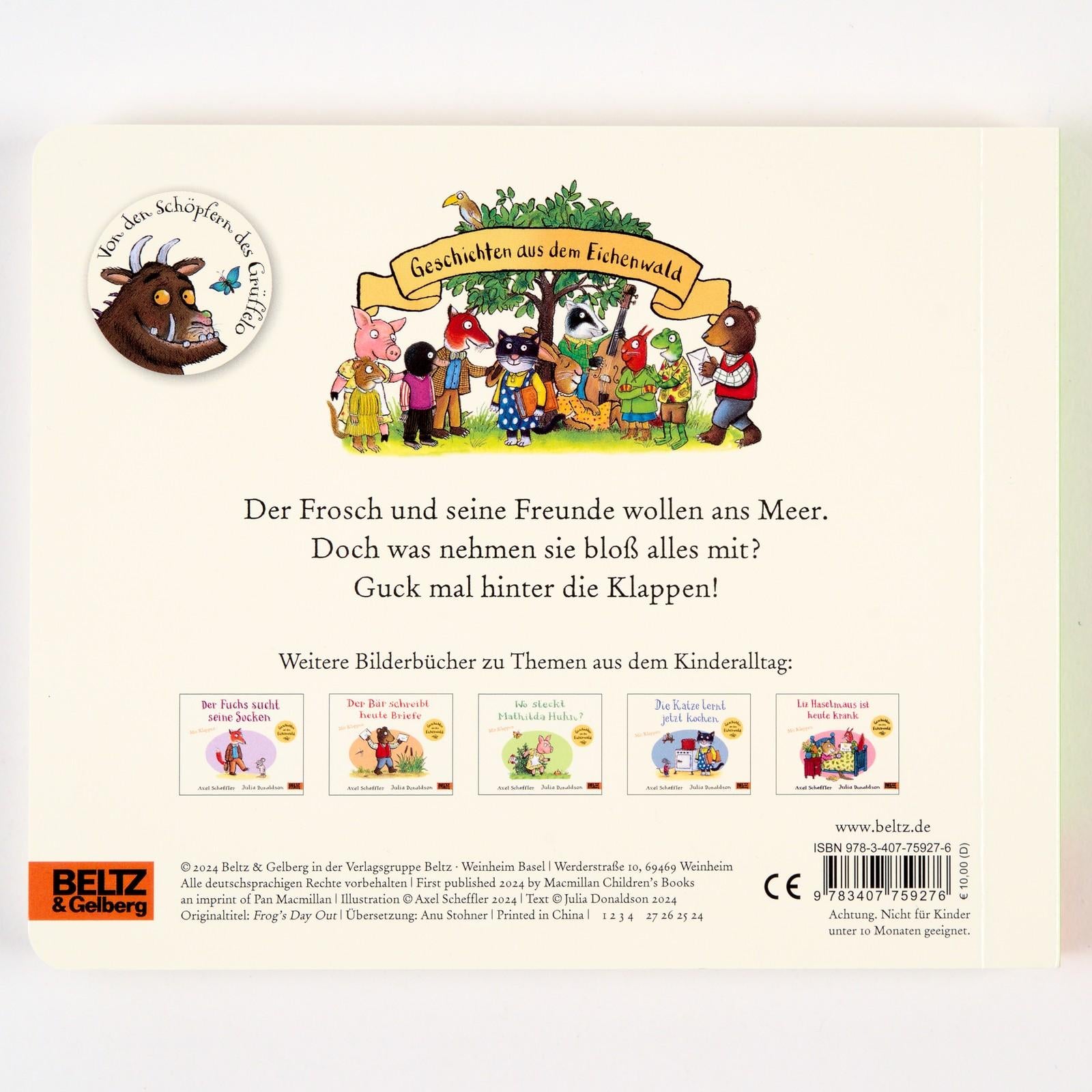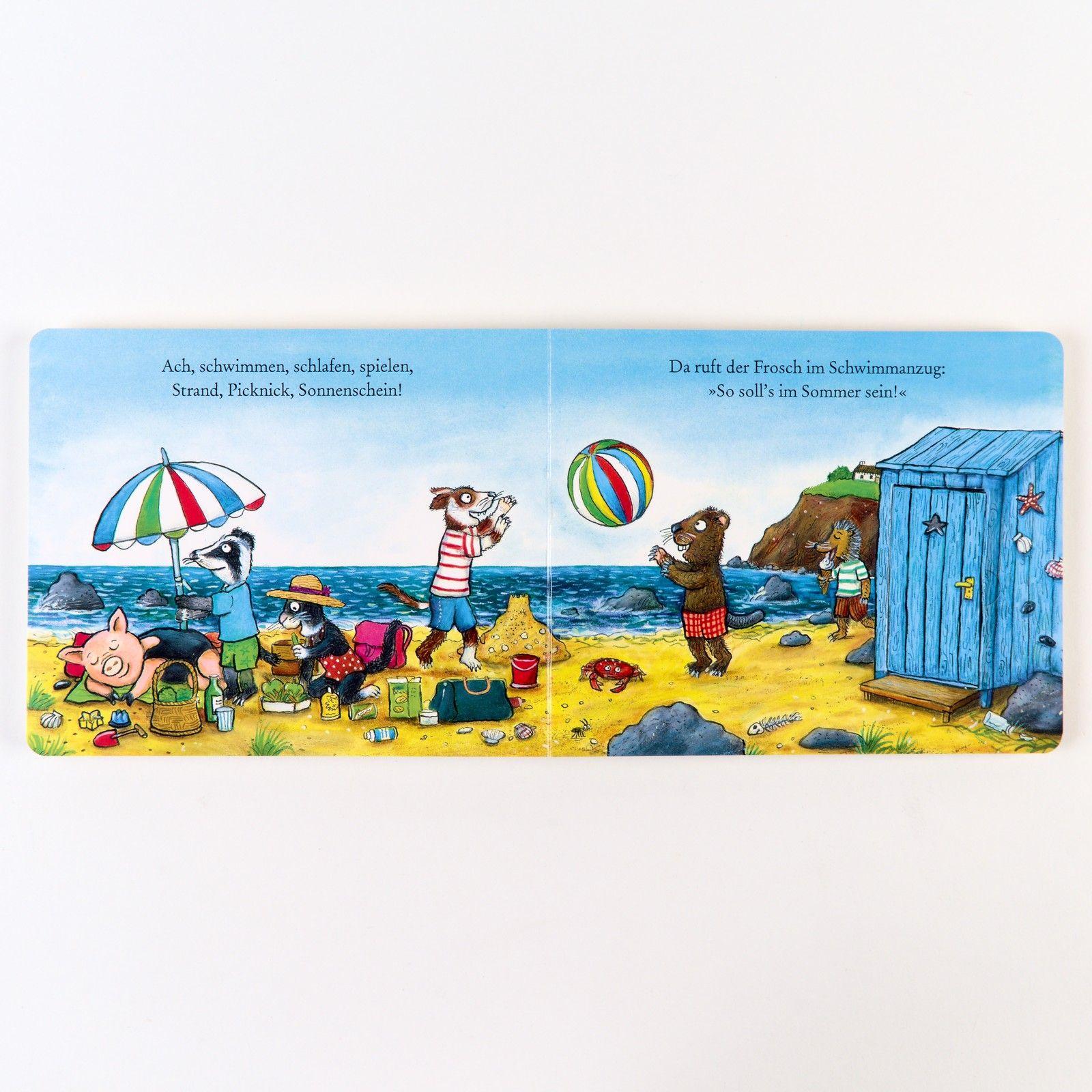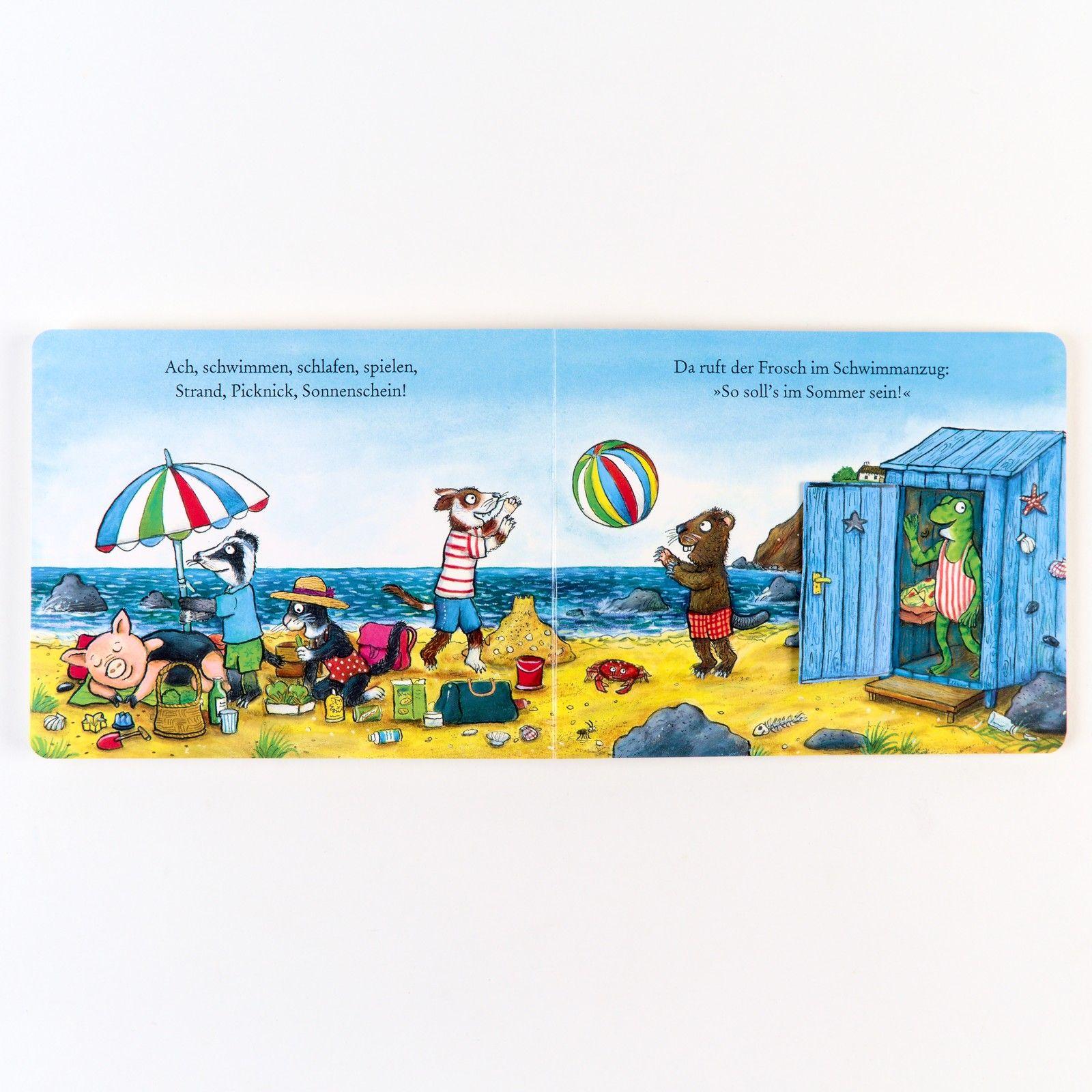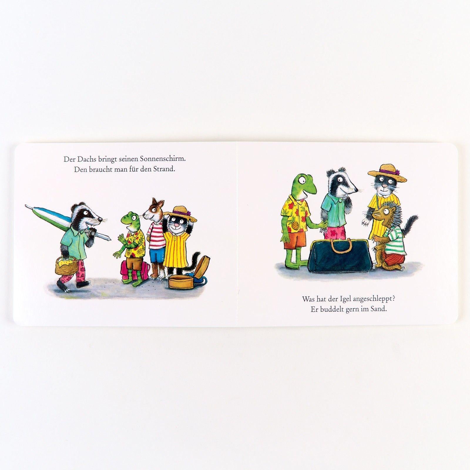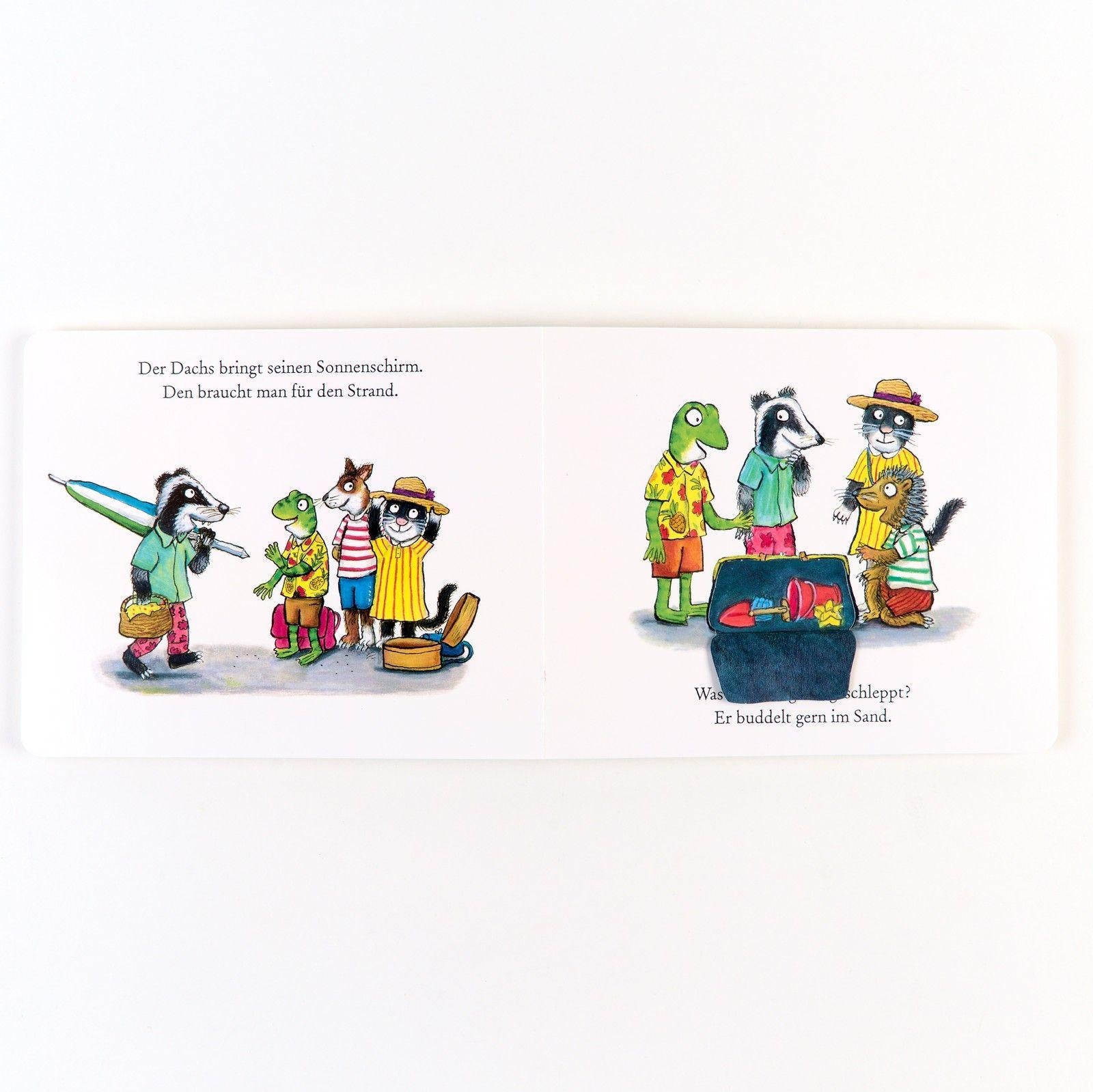 Der Frosch will heute ans Meer und alle seine Freunde kommen mit. Der Dachs packt den Sonnenschirm ein, die Katze ihren Ball. Und was schleppt der Igel mit? Wenn man hinter die Klappen guckt, sieht man, was sie zum Spielen alles brauchen. Ein Pappbilderbuch von den Schöpfern des Grüffelo mit vielen Klappen für neugierige Kinder, die begeistert beim Suchen helfen können. Mit bunten Bildern und lustigen Reimen, mit denen Vorlesen großen Spaß macht. In allen Bilderbüchern aus der Reihe 'Geschichten aus dem Eichenwald' geht es um Themen aus dem Kinderalltag. In diesem Buch geht es um einen Ausflug mit Freunden, das Verreisen mit dem Zug und das Spielen am Strand. Weitere Geschichten aus dem Eichenwald: ¿ Der Fuchs sucht seine Socken ¿ Wo steckt Mathilda Huhn? ¿ Die Katze lernt jetzt kochen ¿ Kaninchen ist sooo müde ¿ Evi Eichhorns Schneemann ¿ Der Bär schreibt heute Briefe ¿ Der Dachs spielt super Kontrabass ¿ Wo ist die Brille von Max Maulwurf? ¿ Liz Haselmaus ist heute krank