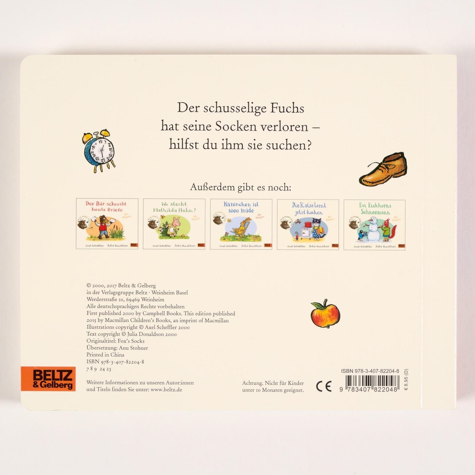 Der Fuchs kann seine Socken nicht finden, er hat schon kalte Zehen. Da hat er Glück, dass die Maus nicht so schusselig ist wie er, denn was sie sucht, das findet sie auch! Ein Pappbilderbuch von den Schöpfern des Grüffelo mit vielen Klappen für neugierige Kinder, die begeistert beim Suchen helfen können. Mit bunten Bildern und lustigen Reimen, mit denen Vorlesen großen Spaß macht. In allen Bilderbüchern aus der Reihe 'Geschichten aus dem Eichenwald' geht es um Themen aus dem Kinderalltag. In diesem Buch geht es um sich Anziehen und um das Finden, wenn eine Soche verschwunden ist. Weitere Geschichten aus dem Eichenwald: ¿ Wo steckt Mathilda Huhn? ¿ Die Katze lernt jetzt kochen ¿ Kaninchen ist sooo müde ¿ Evi Eichhorns Schneemann ¿ Der Bär schreibt heute Briefe ¿ Der Dachs spielt super Kontrabass ¿ Wo ist die Brille von Max Maulwurf? ¿ Der Frosch freut sich aufs Meer ¿ Liz Haselmaus ist heute krank