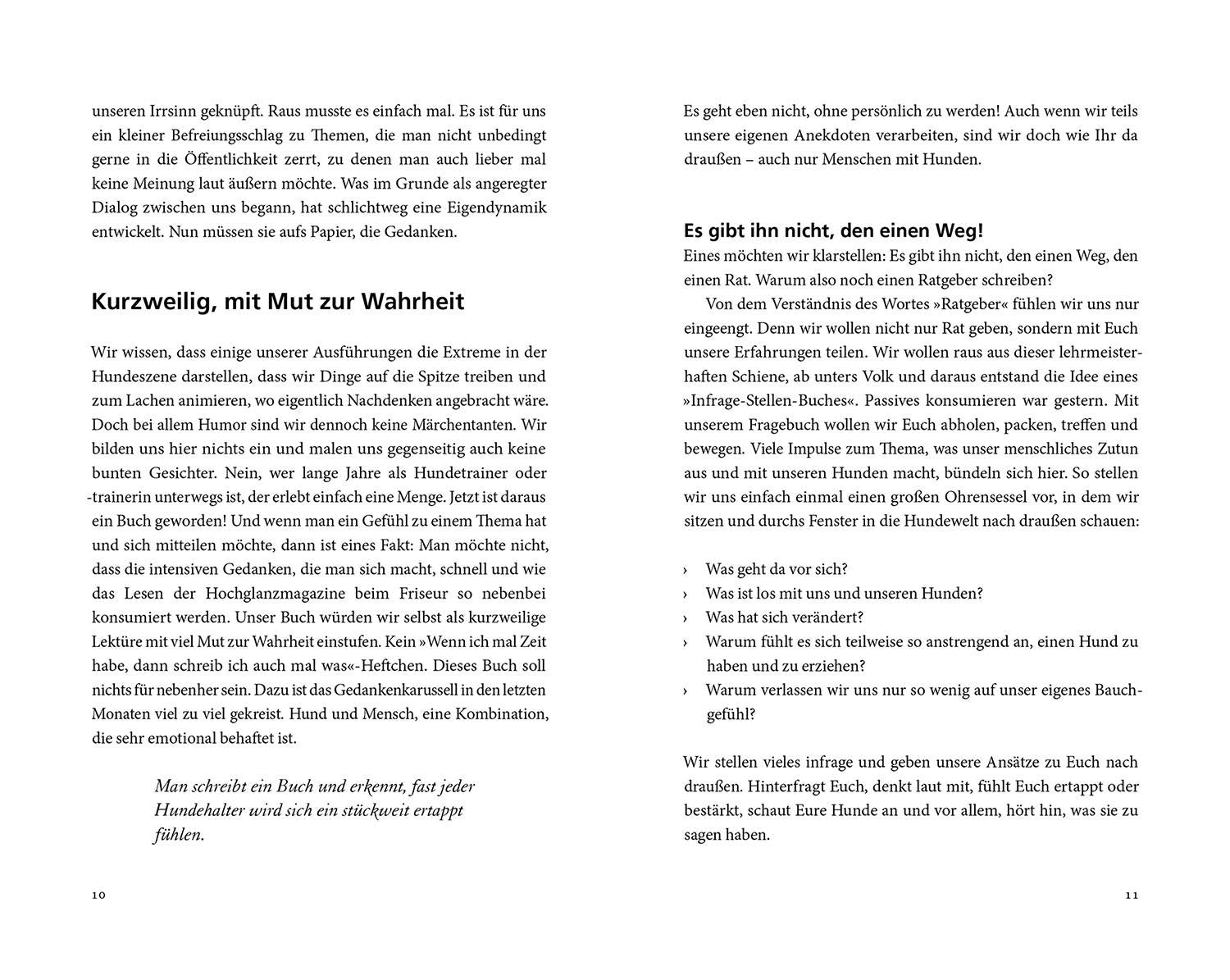 In rasantem Tempo, mit viel Wortwitz und Humor schreiten die Autorinnen durch die Hundeszene und halten Hundehaltern, Trainern, Züchtern, Tierschützern und sich selbst den Spiegel vor. Immer wieder muss man herzhaft lachen, doch auch trocken schlucken, denn die eigenen Verhaltensweisen und alle Entscheidungen, die man in Bezug auf den Hund trifft, haben direkte Auswirkung auf ihn. Man sollte sich also gut überlegen, was man selbst so tut! Erstaunliche Einsichten und großes Lesevergnügen: das ideale Geschenk für Hundefreunde.