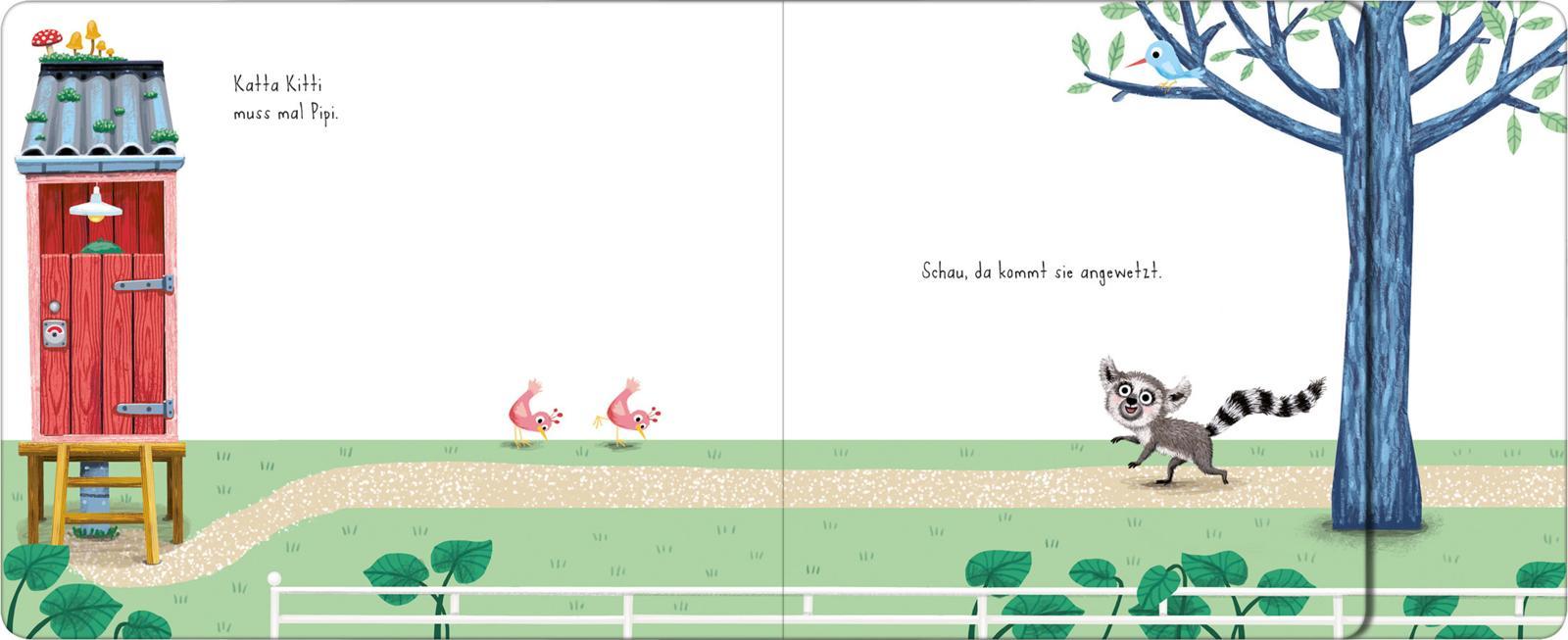 Katta Kitti muss mal Pipi, doch das Klo ist schon besetzt! Bald stehen alle Zootiere Schlange vor dem Klohäuschen, denn auch der Elefant, die Pinguine und die Äffchen müssen ganz dringend. Da kommt Hugo Schlange und drängelt sich vor - so eine Frechheit! Endlich geht die Tür vom Klohäuschen auf ... Wer da wohl herauskommt?