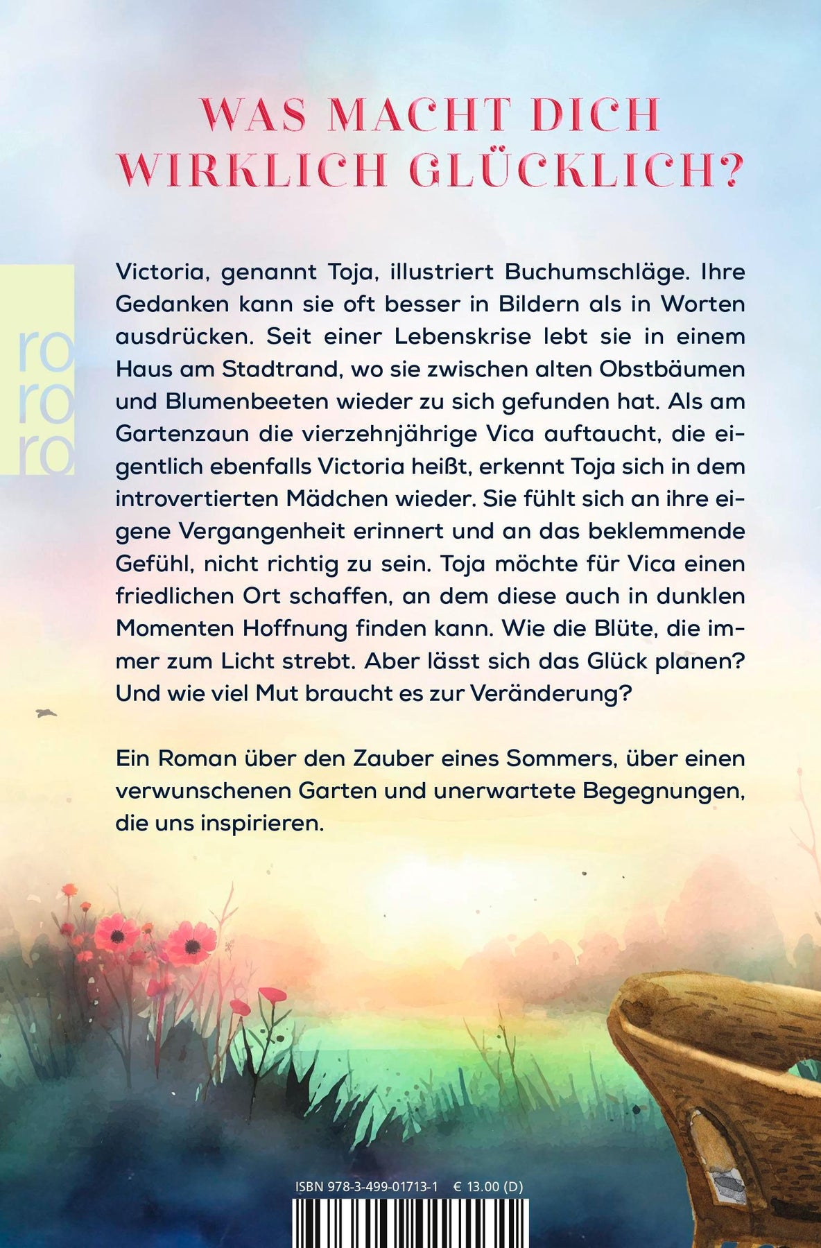 Victoria, genannt Toja, illustriert Buchumschläge. Ihre Gedanken kann sie oft besser in Bildern als in Worten ausdrücken. Seit einer Lebenskrise lebt sie in einem Haus am Stadtrand, wo sie zwischen alten Obstbäumen und Blumenbeeten wieder zu sich gefunden hat. Als am Gartenzaun die vierzehnjährige Vica auftaucht, die eigentlich ebenfalls Victoria heißt, erkennt Toja sich in dem introvertierten Mädchen wieder. Sie fühlt sich an ihre eigene Vergangenheit erinnert und an das beklemmende Gefühl, nicht richtig zu sein. Toja möchte für Vica einen friedlichen Ort schaffen, an dem diese auch in dunklen Momenten Hoffnung finden kann. Wie die Blüte, die immer zum Licht strebt. Aber lässt sich das Glück planen? Und wie viel Mut braucht es zur Veränderung?
