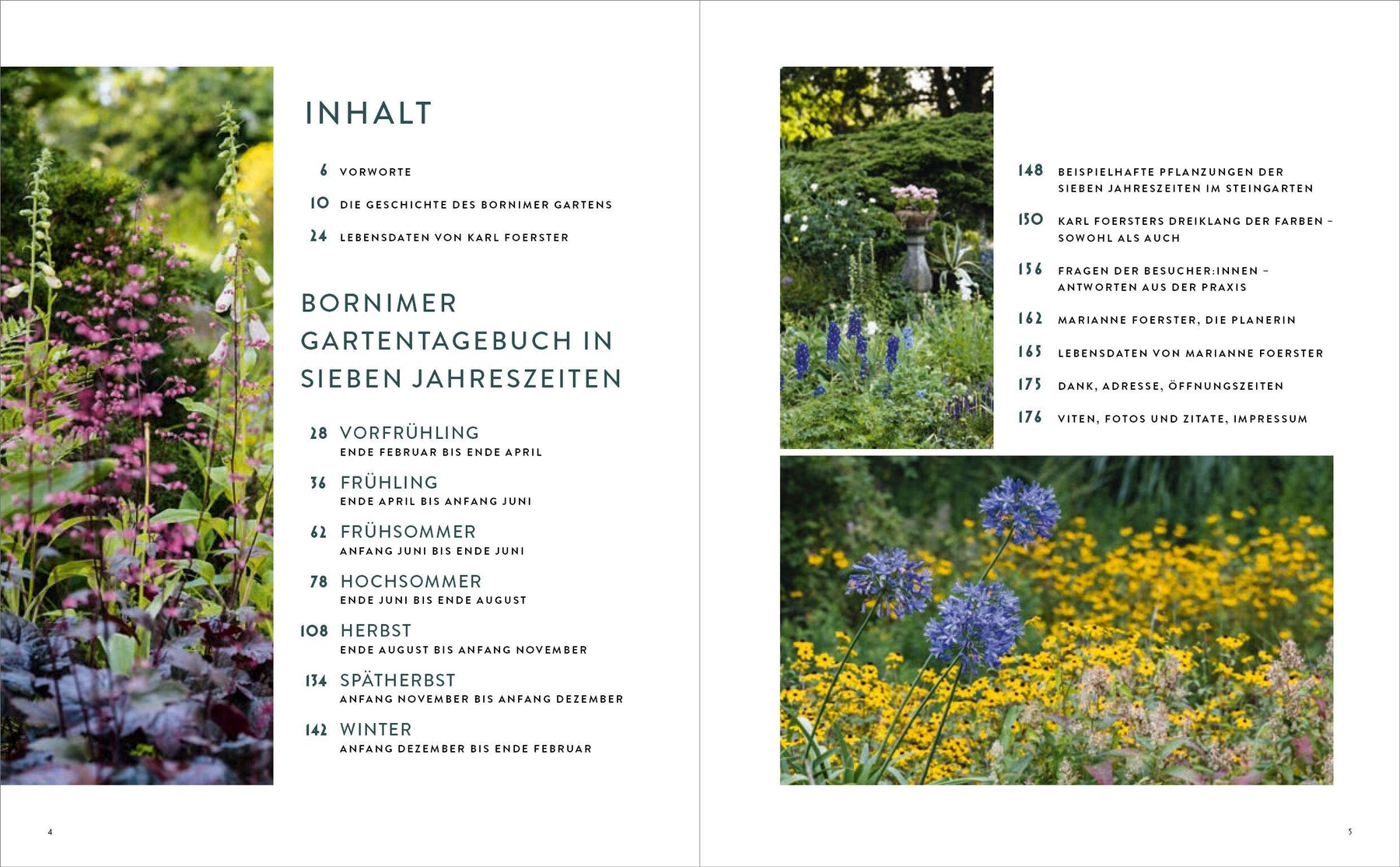 Der Garten, den der berühmte Staudenzüchter Karl Foerster (1874-1970) ab 1911 in Potsdam-Bornim anlegte, ist ein grandioses Gesamtkunstwerk und bis heute ein beliebtes Ziel für alle Gartenenthusiasten. Seine Tochter Marianne mit ihrem Gespür für Pflanzen pflegte dieses Blütenparadies über 20 Jahre lang. In ihrem sehr persönlichen Gartentagebuch geleitet sie durch den Senkgarten, den Frühlingsweg, das Herbstbeet und den Steingarten. Illustriert ist dieser Streifzug mit stimmungsvollen Fotos durch alle sieben Jahreszeiten. Ein geschichtlicher Überblick stellt die Entwicklung der Anlage aus Schaugarten, Wohnhaus und Gärtnerei vor. Garten und Wohnhause stehen heute unter Denkmalschutz. Erstmalig wird Marianne Foersters Werk als Gartenplanerin vorgestellt. Weitere Extras sind Karl Foersters beliebte Dreiklang-Kombinationen der Blütenfarben sowie Profi-Tipps der Chefgärtnerin zur Anpassung von Gärten an den Klimawandel oder dem fachgerechten Rückschnitt von Stauden uvm.