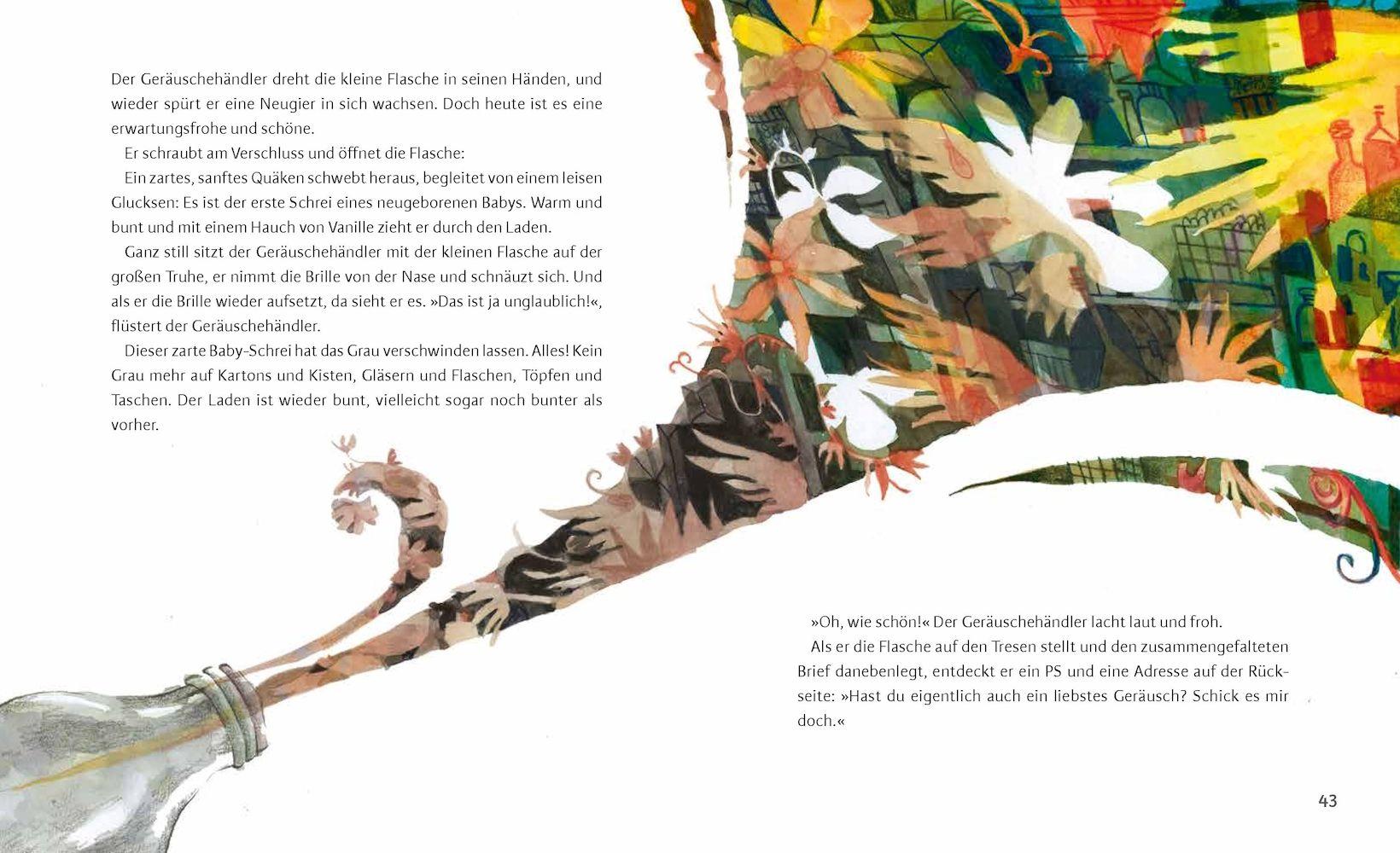 Der Geräuschehändler ist zurück von der großen Welt-Geräusche-Reise. Noch während er seine mitgebrachten Geräusche auspackt, kommen neue Kundinnen in seinen zauberhaften Laden: zwei Badehosen wünschen sich einen herzhaften Arschbomben-Klatscher, ein Außerirdischer ein echtes Souvenir von der Erde und wie klingt eigentlich Himbeereis? Alles kein Problem für den Spezialist für klangvolle Wünsche! Bis eines Tages das Monster seinen Rucksack in dem Geräuscheladen abstellt. Trotz aller Warnungen ist der Geräuschehändler zu neugierig und öffnet ihn...