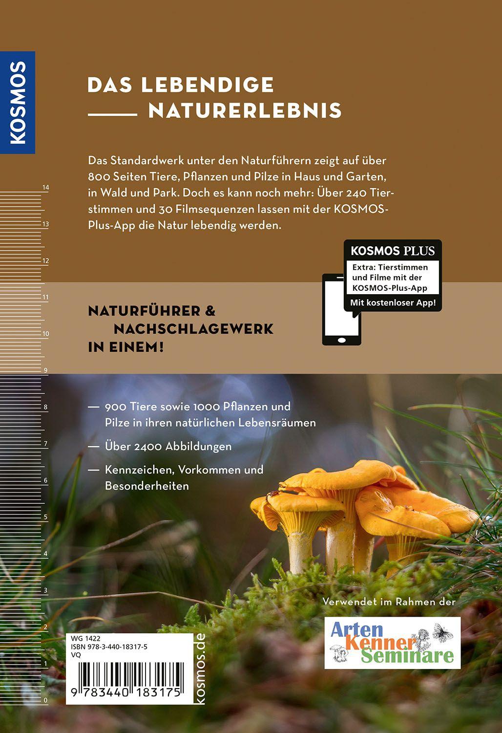 Das Nachschlagewerk in Sachen Natur! Hier findet sich alles, was in Haus und Garten, bei Spaziergängen, Wanderungen und im Urlaub zu entdecken ist. 900 Tiere (Wirbeltiere: Säugetiere, Vögel, Reptilien und Amphibien, Fische; Wirbellose: Insekten, Spinnen, Krebse, Schnecken, Muscheln, Würmer, Stachelhäuter) sowie 1000 Pflanzen (Bäume und Sträucher, Blütenpflanzen, Gräser, Farne, Moose, Flechten, Algen) und Pilze in ihren natürlichen Lebensräumen - das ist Artenfülle pur! Über 2400 Abbildungen und gezielte Informationen zu Kennzeichen, Vorkommen und Besonderheiten zeigen die schönsten Seiten der Natur. Der KOSMOS-Farbcode garantiert einen schnellen Zugriff auf die Artengruppen. Das Plus zum Buch: die kostenlose KOSMOS-PLUS-App mit 243 Tierstimmen und 30 Filmen.