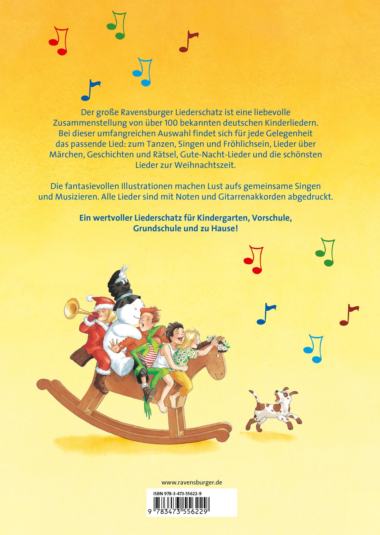 Der große Ravensburger Liederschatz ist eine liebevolle Zusammenstellung von über 100 bekannten und beliebten deutschen Kinderliedern: zum Tanzen, Singen und Fröhlichsein, Liedern über Märchen, Geschichten und Rätsel, Gute-Nacht-Lieder und besinnliche Weihnachtslieder.