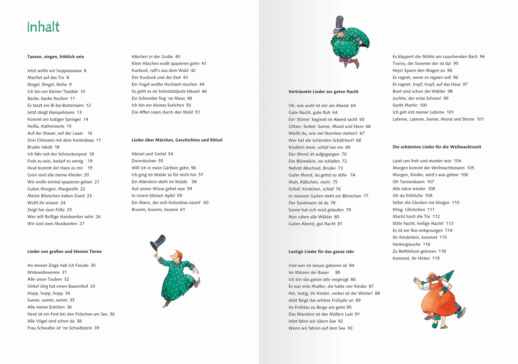 Dieser wertvolle Liederschatz macht Lust aufs gemeinsame Singen und Musizieren. Ob Schlaflieder, Weihnachtslieder oder traditionelle deutsche Kinderlieder - hier findet sich für jeden Anlass das passende Gesangsstück. Alle Lieder sind mit Notensatz und Gitarrenakkorden abgebildet, sodass das Mitsingen und Musizieren zum Kinderspiel wird.