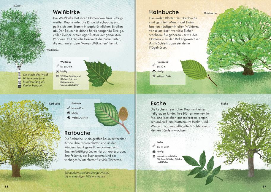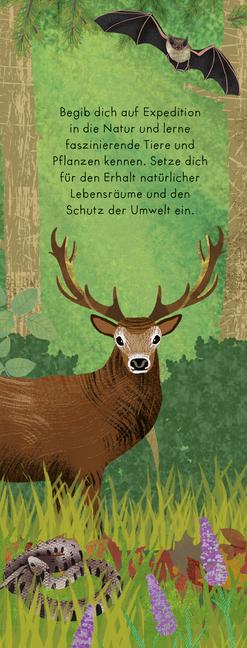 Dieser liebevoll illustrierte Naturführer stellt Säugetiere, Amphibien, Reptilien, Insekten, Wirbellose und Vögel, aber auch Farne, Pilze, Bäume, Sträucher und Pflanzen vor. Jede Art wird in kurzen Texten beschrieben. Die wichtigsten Infos zu Größe, Habitat, Nahrung und ähnlichem finden sich auf einen Blick im Faktenkasten. Dazu gibt es Wissen über Lebensräume, die Natur im Jahreskreis und zum Umweltschutz.