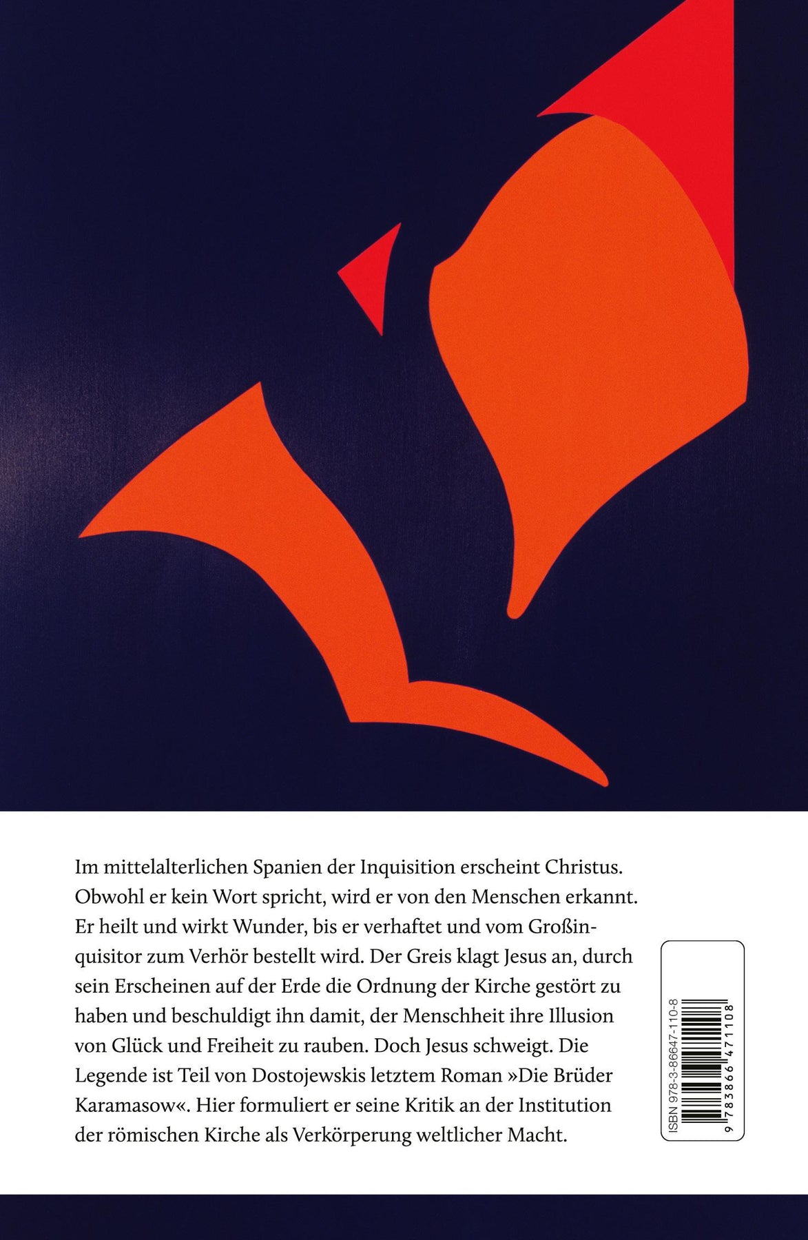 Im mittelalterlichen Spanien der Inquisition erscheint Christus. Obwohl er kein Wort spricht, wird er von den Menschen erkannt. Er heilt und wirkt Wunder, bis er verhaftet und vom Großinquisitor zum Verhör bestellt wird. Der Greis klagt Jesus an, durch sein Erscheinen auf der Erde die Ordnung der Kirche gestört zu haben und beschuldigt ihn damit, der Menschheit ihre Illusion von Glück und Freiheit zu rauben. Doch Jesus schweigt. Die Legende ist Teil von Dostojewskis letztem Roman 'Die Brüder Karamasow'. Hier formuliert er seine Kritik an der Institution der römischen Kirche als Verkörperung weltlicher Macht.