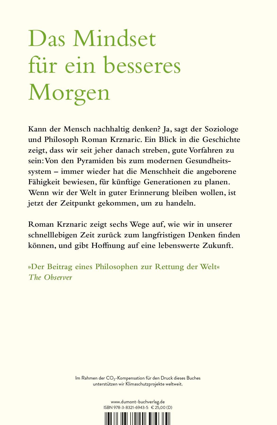 Wir leben in einer Zeit, die vom kurzfristigen Denken beherrscht wird. Aber in fünfzig, in hundert, in fünfhundert Jahren werden immer noch Menschen auf unserem Planeten leben, arbeiten, lieben und träumen. Sie alle werden tiefgreifend davon beeinflusst sein, wie wir heute handeln. Die größte Frage, vor der jeder von uns steht, lautet also: Wie können wir gute Vorfahren sein? Roman Krznaric hat die Antwort. Von bahnbrechenden Konzepten wie dem 'Kathedralendenken' über Zukunftsräte in Japan bis hin zu einer Bibliothek in Norwegen, die erst 2114 ihre Pforten öffnet, um einhundert bis dahin unveröffentlichte literarische Werke zu präsentieren: Inspiriert von Lösungen aus der ganzen Welt, erklärt er, wie wir lernen können, heute langfristig zu denken, um ein besseres Morgen zu schaffen. Der Pfad des guten Vorfahren liegt vor uns. Wir müssen ihn jetzt beschreiten.