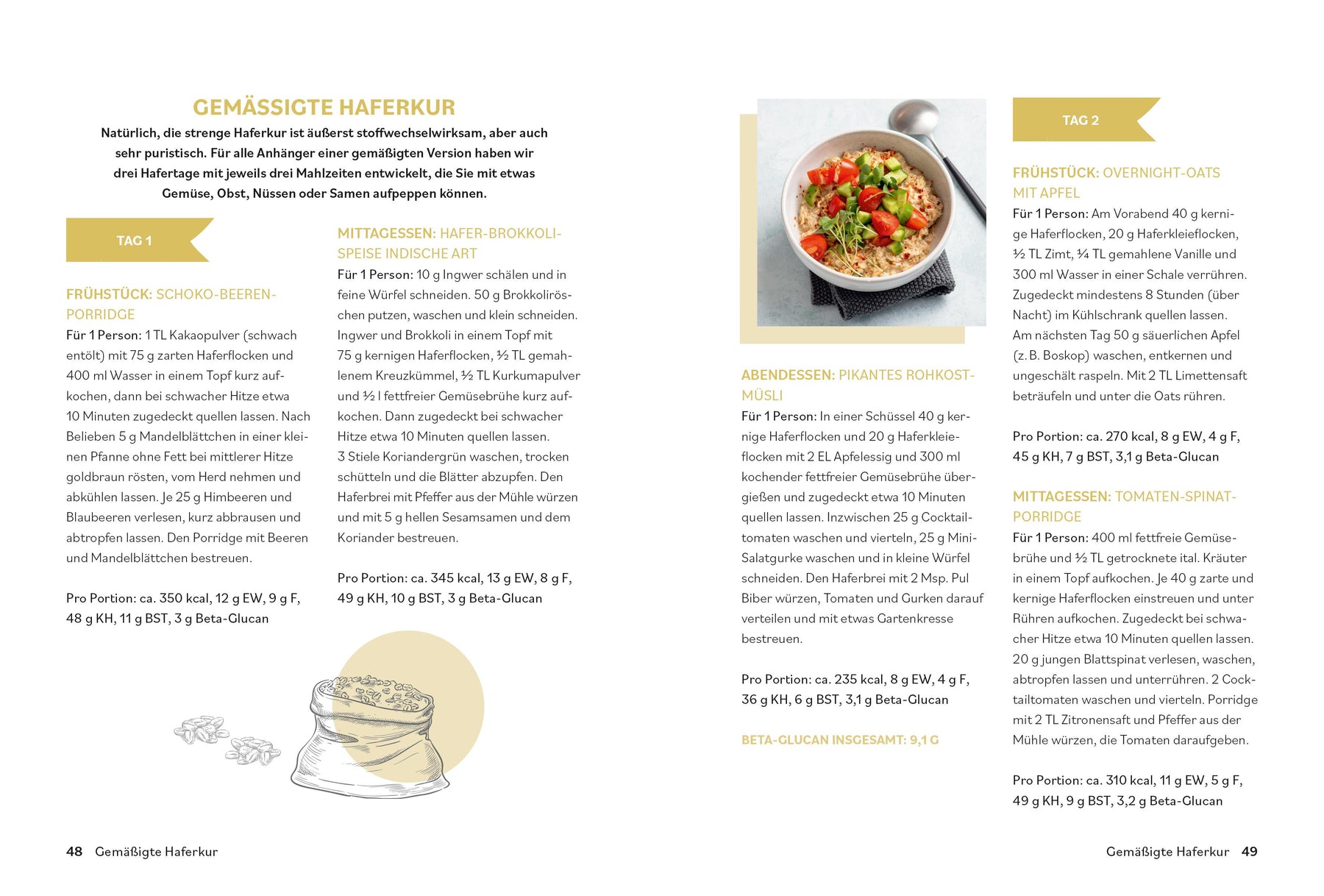 Mit Dr. Riedls 2-Wochen-Masterplan lassen sich die kleinen Nährstoffwunderganz einfach in den Speiseplan einbauen: Drei abwechslungsreiche Mahlzeiten pro Tag machen die moderne Form der Haferkur nicht nur gesund, sondern auch lecker. Dazu gibt es Hafer-Basisrezepte, wertvolle Ernährungstipps und alles Wissenswerte rund um das Supergetreide.