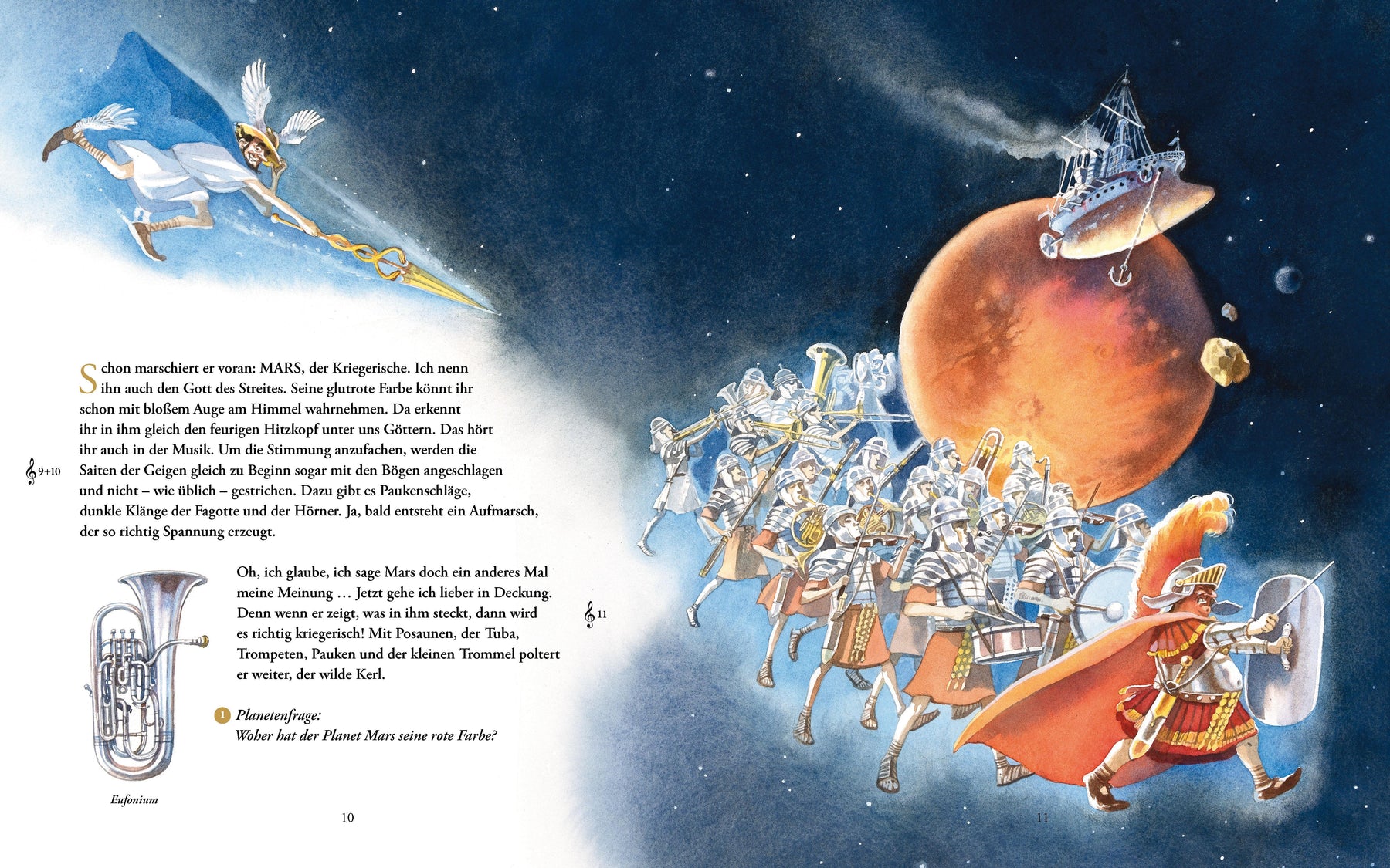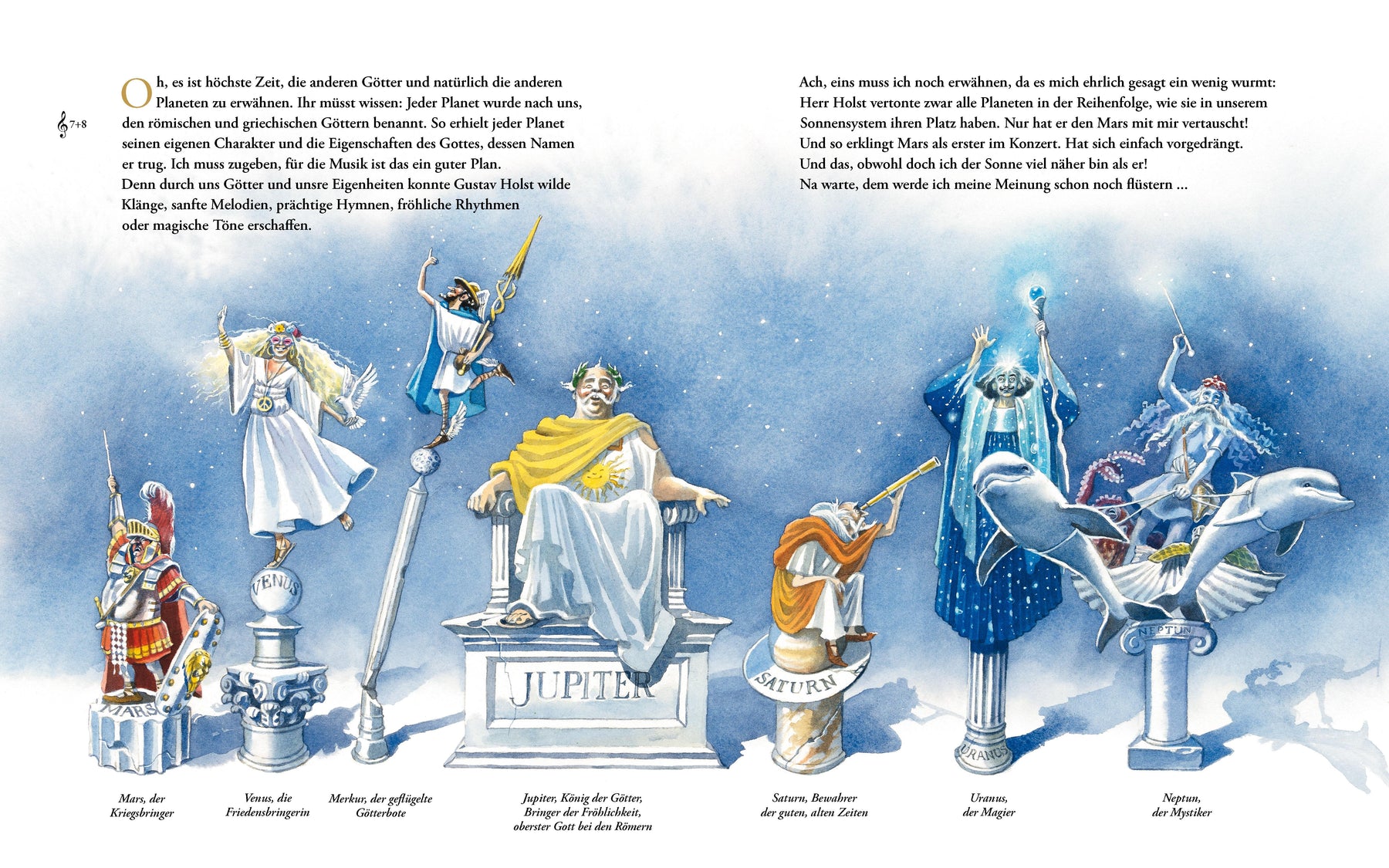Gustav Holsts vielseitige und spannende Musik begleitet zu den Planeten und erzählt auch über die Eigenschaften der Götter, nach denen sie benannt sind. Wer könnte da besser durch das Buch führen als Merkur, der Götterbote? Gewitzt stellt er seine Götterkolleg*innen und deren Planeten vor. Dieses monumentale Werk beeinflusste Musikgrößen wie Frank Zappa oder Iron Maiden und inspirierte weltberühmte Filmmusiken, u.a. Star Trek und Gladiator.