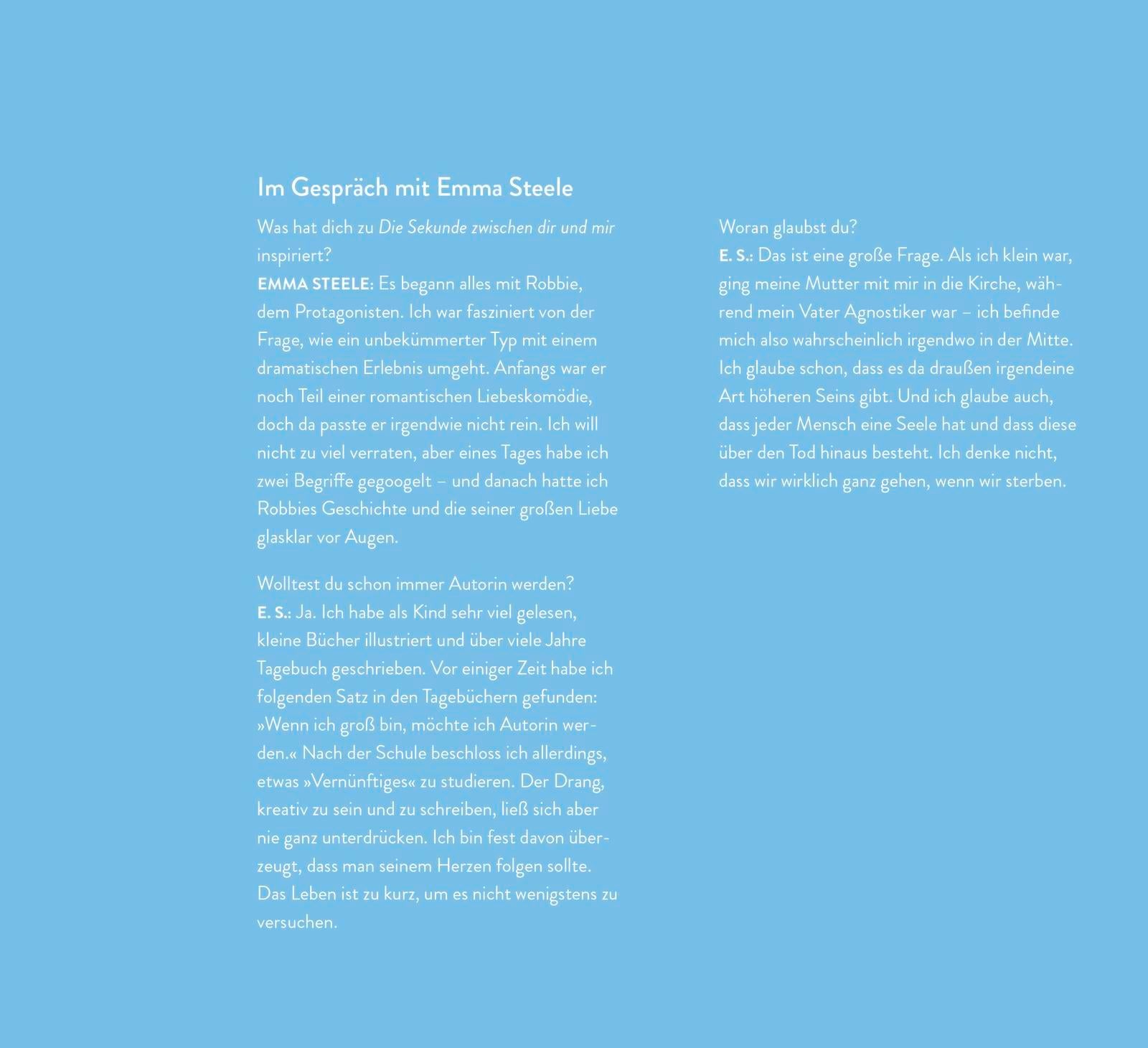 Tragisch, hochspannend und tief bewegend erzählt die schottische Autorin Emma Steele in ihrem Liebesroman eine Geschichte, die Leser*innen von 'Zwei an einem Tag' oder 'Die Frau des Zeitreisenden' und Fans von Filmen wie 'Sliding Doors' begeistern wird.