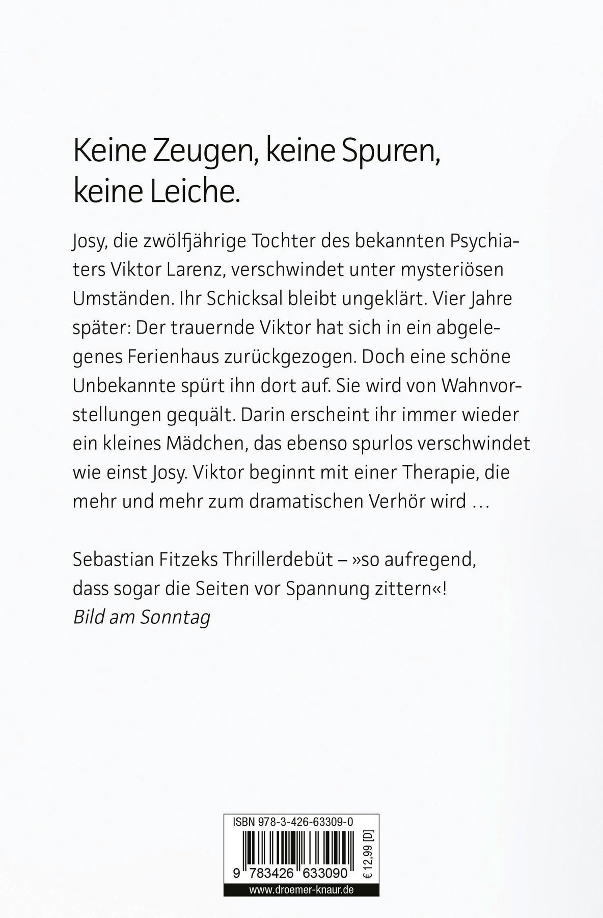 Keine Zeugen, keine Spuren, keine Leiche. Josy, die zwölfjährige Tochter des bekannten Psychiaters Viktor Larenz, verschwindet unter mysteriösen Umständen. Ihr Schicksal bleibt ungeklärt.