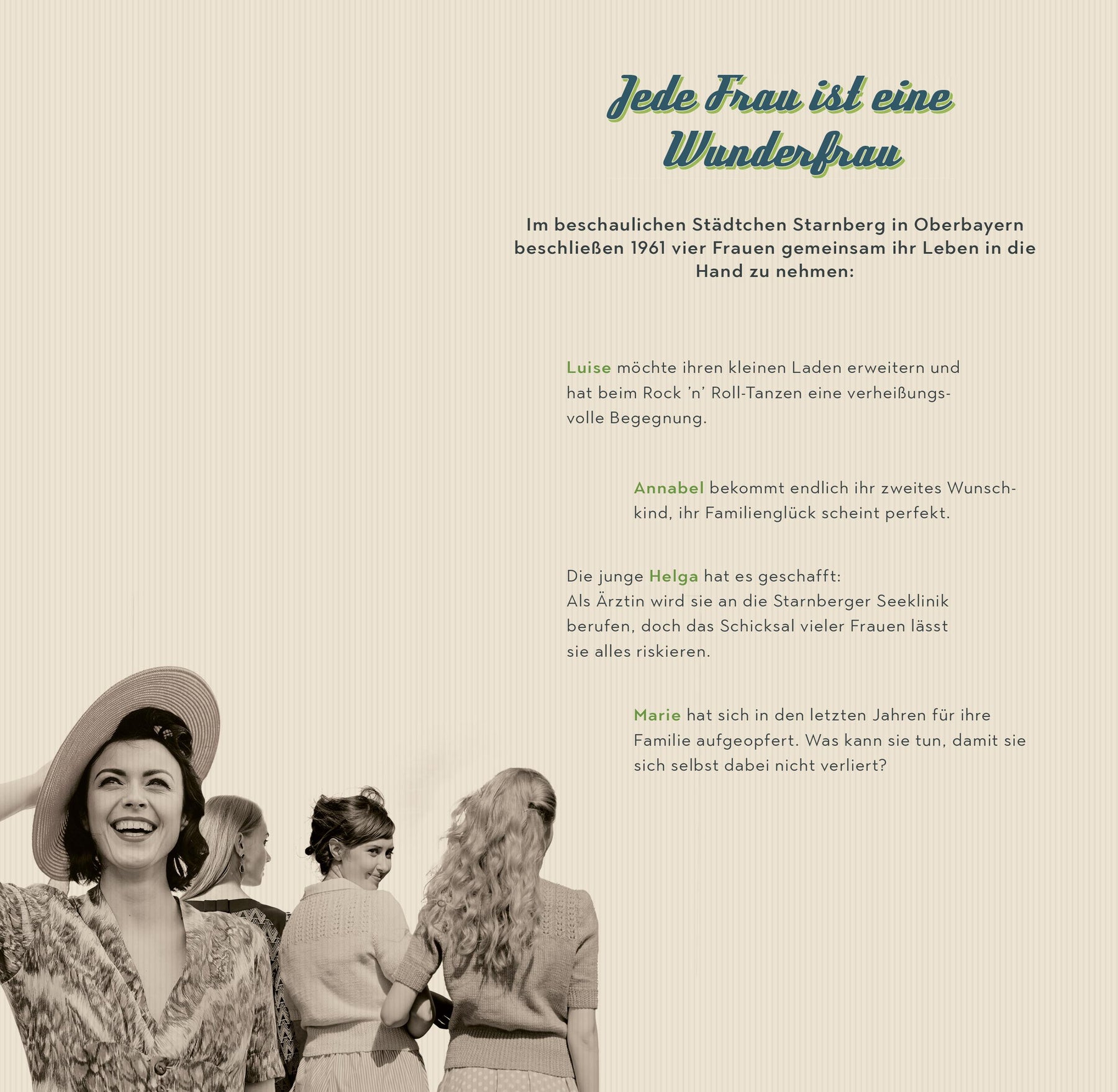 Zu Beginn der 1960er Jahre stimmen die Errungenschaften der Frauenbewegung, die neuartige 'Pille' und die vielen neuen Möglichkeiten Luise zuversichtlich, außerdem ist in ihrem kleinen Laden viel zu tun, er ist ihr ganzer Stolz. Voller Tatendrang plant sie einen Umbau - sie möchte mit der Zeit gehen und Selbstbedienung anbieten. Doch nicht alles klappt so, wie erhofft. Zum Glück sind ihre drei Freundinnen weiterhin an ihrer Seite: die alleinerziehende Helga, Marie, die um ihre Familie kämpft und Annabel, die endlich eine Tochter bekommt - ein Contergan-Kind. Gemeinsam merken sie: Das Schicksal hat sie in den letzten Jahren enger verbunden als sie dachten.