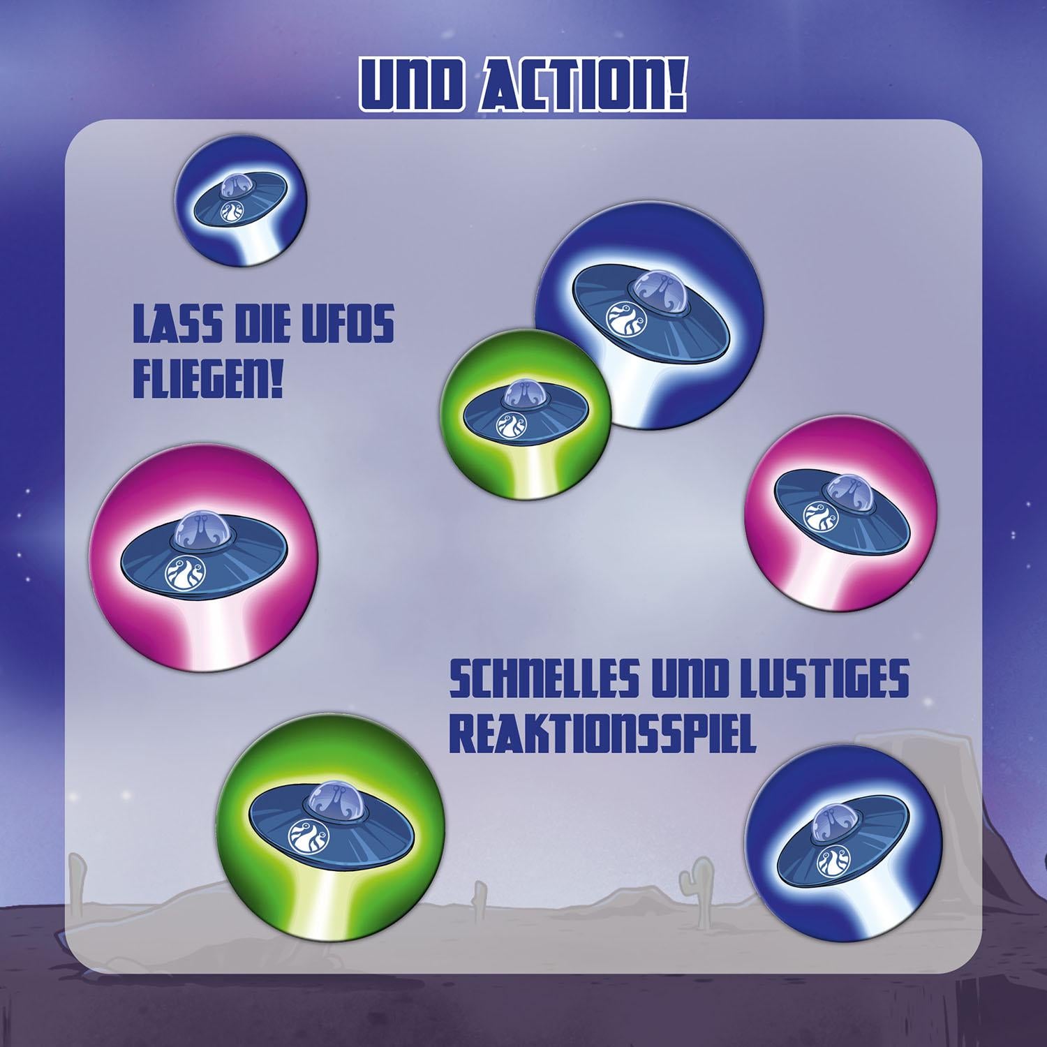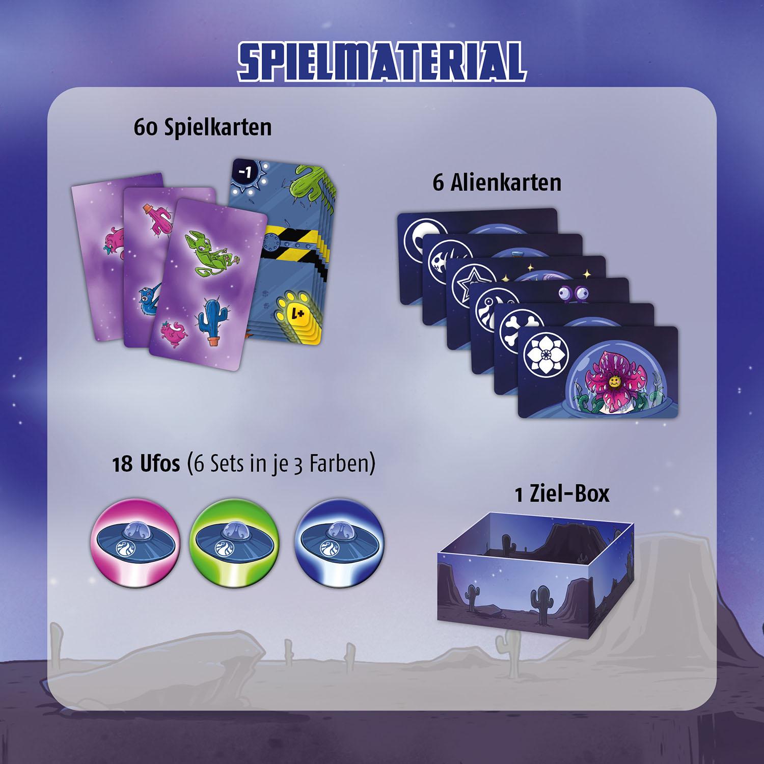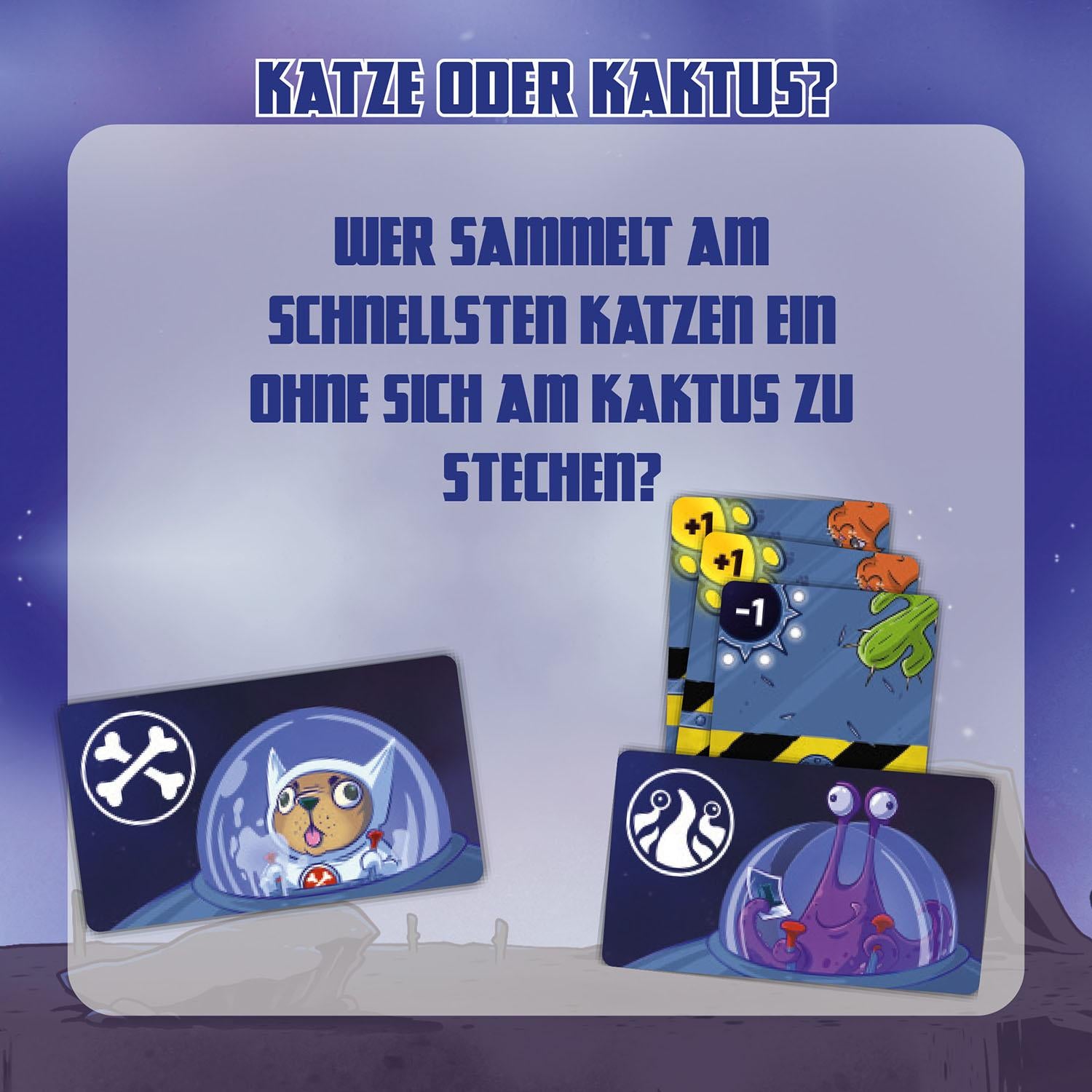 Lustiges Gesellschaftsspiel ab 7 Jahren für die ganze Familie. Spannendes Kartenspiel für 2-6 Personen. Schnelle Regeln und viel Spielspaß. Tolles Reisespiel in der praktischen Open & Play-Magnetschachtel zum Mitnehmen und Verschenken. Achtung, Katze oder Kaktus? Auf Kommando decken die Spielerinnen und Spieler gleichzeitig die Karten auf. Jetzt genau hinschauen! Wo stecken die Katzen? Schnell die passende Ufo-Scheibe zum richtigen Zeitpunkt in die Box werfen, um die Katzen mit dem Lichtstrahl einzusammeln. Doch aufgepasst: Unter die Katzen haben sich ganz unauffällig Kakteen gemischt, die keine Punkte geben und natürlich auch nicht ins Ufo gehören. Wer schafft es, die meisten Katzen einzusammeln? In diesem lustigen Reaktionsspiel sind Schnelligkeit, Konzentration und Geschick gefragt. Ein blitzschnelles Reisespiel und Mitbringsel für Zwischendurch im Open&Play-Format ab sieben Jahren. Rasanter Spielspaß für zwei bis sechs Personen.