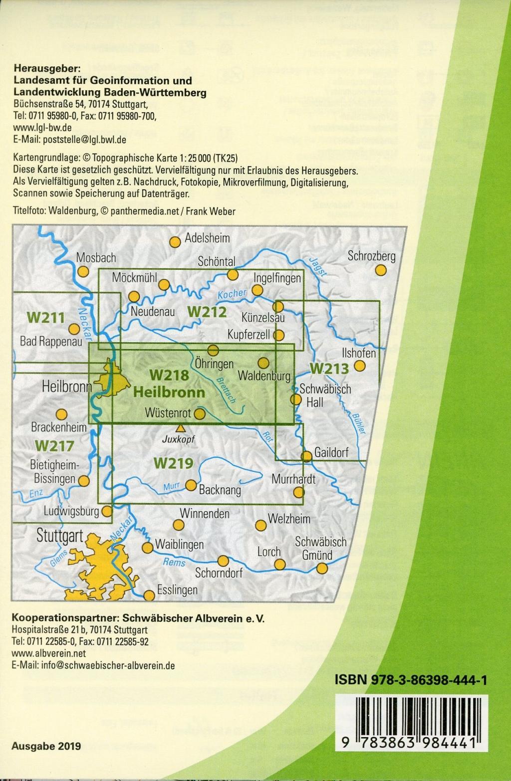 W218 Wanderkarte Heilbronn Maßstab 1:25 000 Gebiet: Heilbronn, Neckarsulm, Weinsberg, Obersulm, Lauffen a.N., Untergruppenbach, Löwenstein, Öhringen, Neuenstein, Waldenburg, Bretzfeld, Pfedelbach, Wüstenrot, Mainhardt, Schwäbisch Hall Inhalt Im idealen Maßstab von 1:25 000 enthält die Wanderkarte die kompletten Wanderwege des Schwäbischen Albvereins e.V. mit einem Teilabschnitt des Limes-Wanderwegs sowie Abschnitten des Jakobus-, Martinus- und des Schwäbischen-Wald-Wegs. Der nördliche Bereich des Naturparks Schwäbisch-Fränkischer Wald mit seinen idyllischen Picknick- und Spielplätzen und dem Breitenauer See sowie die Weinanbaugebiete im Bereich des Neckarlaufs und um Weinsberg bilden den idealen Rahmen für schöne Wanderungen. Die Karte enthält touristische Informationen wie z.B. Aussichtspunkte, Schutzhütten, Grillplätze, Sehenswürdigkeiten, Wanderheime und Gasthäuser in Auswahl. Außerdem besonders gekennzeichnete touristische Objekte und vieles mehr. Zur besseren Orientierung ist das UTM-Gitter in blauer Farbe wiedergegeben. Die Größe des Maßstabs ermöglicht einen detaillierten Überblick über das ausgewählte Gebiet. In Zusammenarbeit mit dem Schwäbischen Albverein e.V. Formate und Lieferarten 96,7 X 66,5 (nur gefaltet auf 10,9 X 16,8 cm lieferbar) ISBN 978-3-86398-444-1 Ausgabe 2019 Herausgeber Landesamt für Geoinformation und Landentwicklung Baden-Württemberg