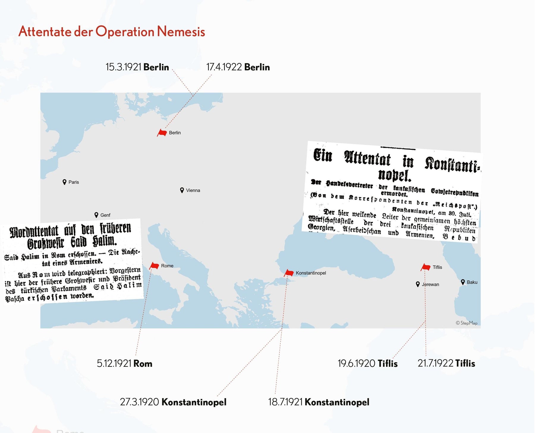 Quer durch Europa und in den Kaukasus, von Paris über Genf nach Berlin, von Istanbul über Wien nach Rom und Tiflis führt die Spur der Geheimoperation Nemesis.