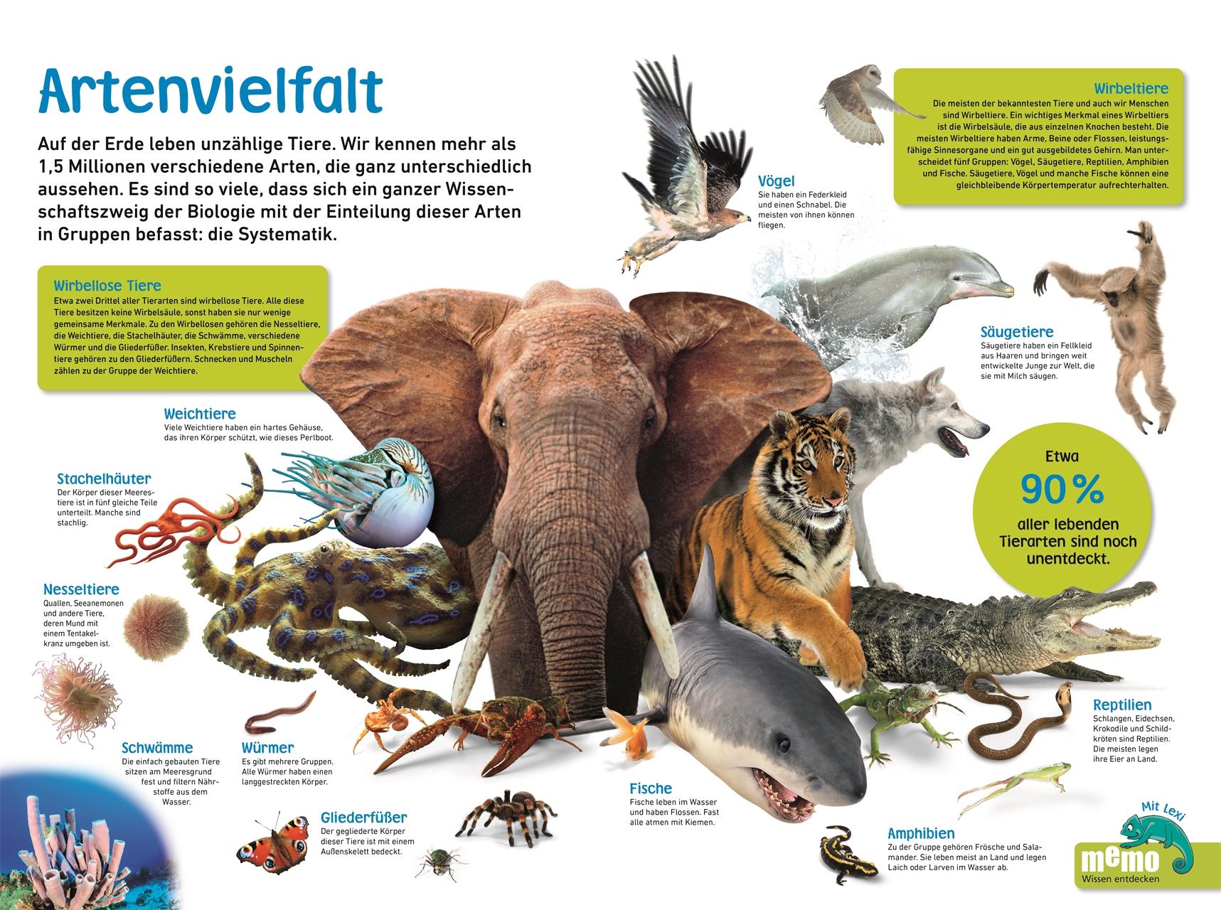 Ob Knallkrebse, Flugfrösche oder Koboldmaki: Die beliebte grüne Kindersachbuchreihe "memo Wissen entdecken" verpackt geniales Wissen über die Welt der Tiere in kurze, lesefreundliche Texte und viele detailreiche Bilder. Im übersichtlichen Layout begleitet das Chamäleon Lexi durchs Buch und hat überraschende Infos parat. Dazu gibt es ein beidseitig bedrucktes Poster mit Tiger-Foto auf der einen und einer informativen Grafik zu den Tiergruppen auf der anderen Seite.
