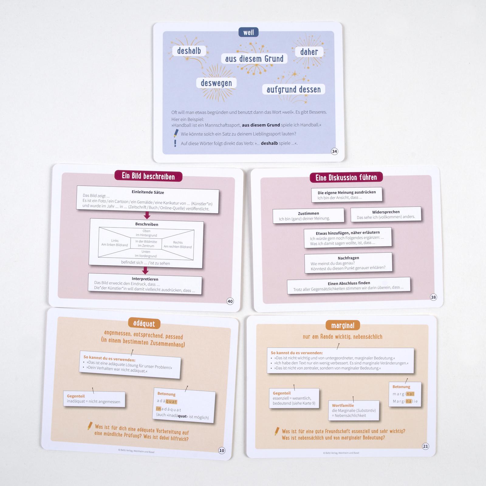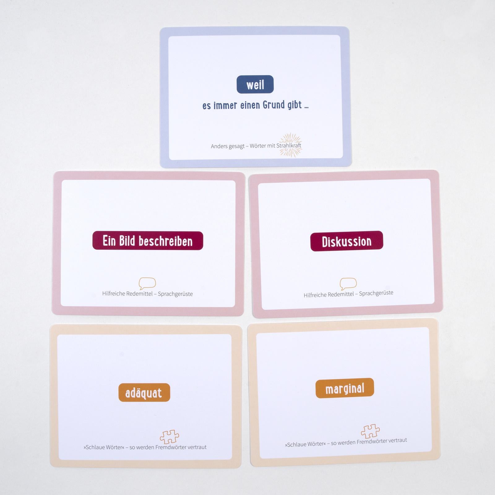 Bildungssprache ist der Schlüssel zur Teilhabe an Bildungsprozessen und Voraussetzung für gelingende Chancengleichheit. Vielen Schüler:innen, die sich im Alltag mühelos verständigen können, fehlt der Zugang zur Schul- und Bildungssprache. Dies birgt die Gefahr, dass sie unterschätzt werden und unter ihren Möglichkeiten bleiben. Hier setzt das Kartenset an. Die 40 Karten unterstützen Schüler:innen der Sekundarstufe I beim Erwerb der Bildungssprache und motivieren zur Umsetzung: von hilfreichen Redemitteln über 'schlaue Wörter' (Fremdwörter) bis hin zu 'Wörtern mit Strahlkraft' (Synonyme) finden sich vielfältige sprachliche Anregungen und zudem kleine Übungen. Sie vermitteln Schüler:innen Sicherheit und Freude, sich bildungssprachlich auszudrücken. Das Set eignet sich für Schüler:innen mit Deutsch als Erst- und Zweitsprache und ist fächerübergreifend einsetzbar. Das Booklet gibt methodische Anregungen für den Einsatz der Karten im Unterricht.
